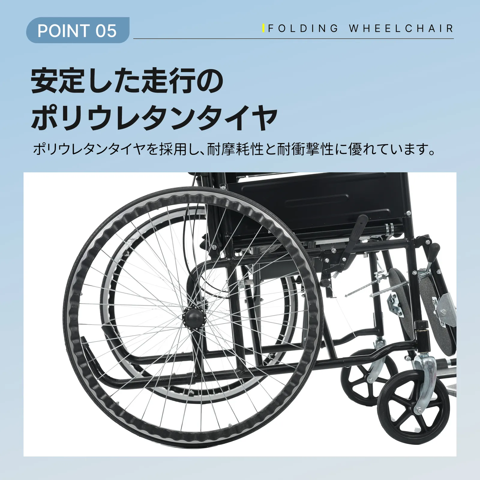 【安定した走行のポリウレタンタイヤ】ポリウレタンタイヤを採用し、耐摩耗性と耐衝撃性に優れています。クッション性があり、屋内外で安定した走行が可能です。 ・◎09