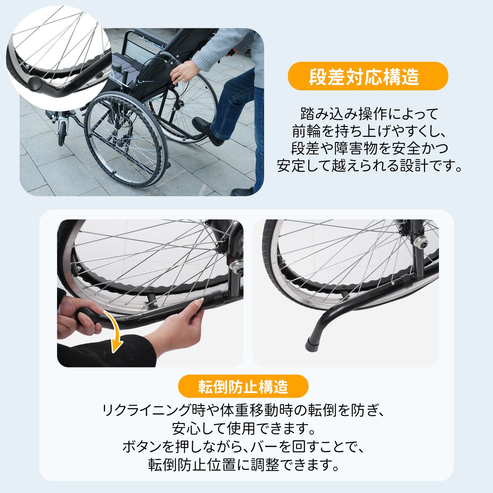 【段差対応構造】踏み込み操作によって前輪を持ち上げやすくし、段差や障害物を安全かつ安定して越えられる設計です。 ・◎08