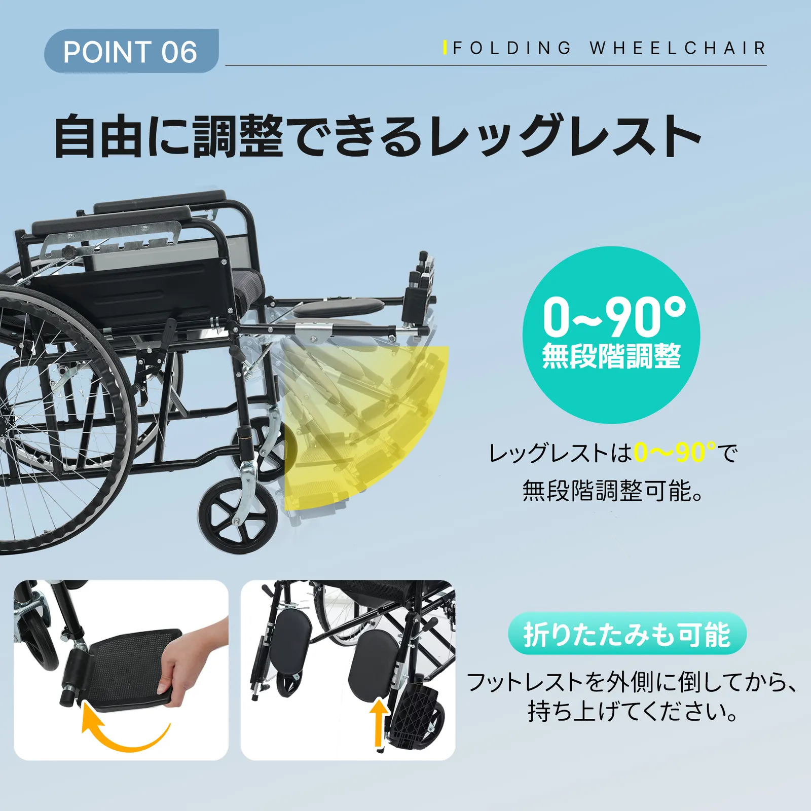 【自由に調整できるレッグレスト】レッグレストは0~90°で無段階調整可能。使用者に合わせて角度を細かく設定でき、脚を快適に支えます。