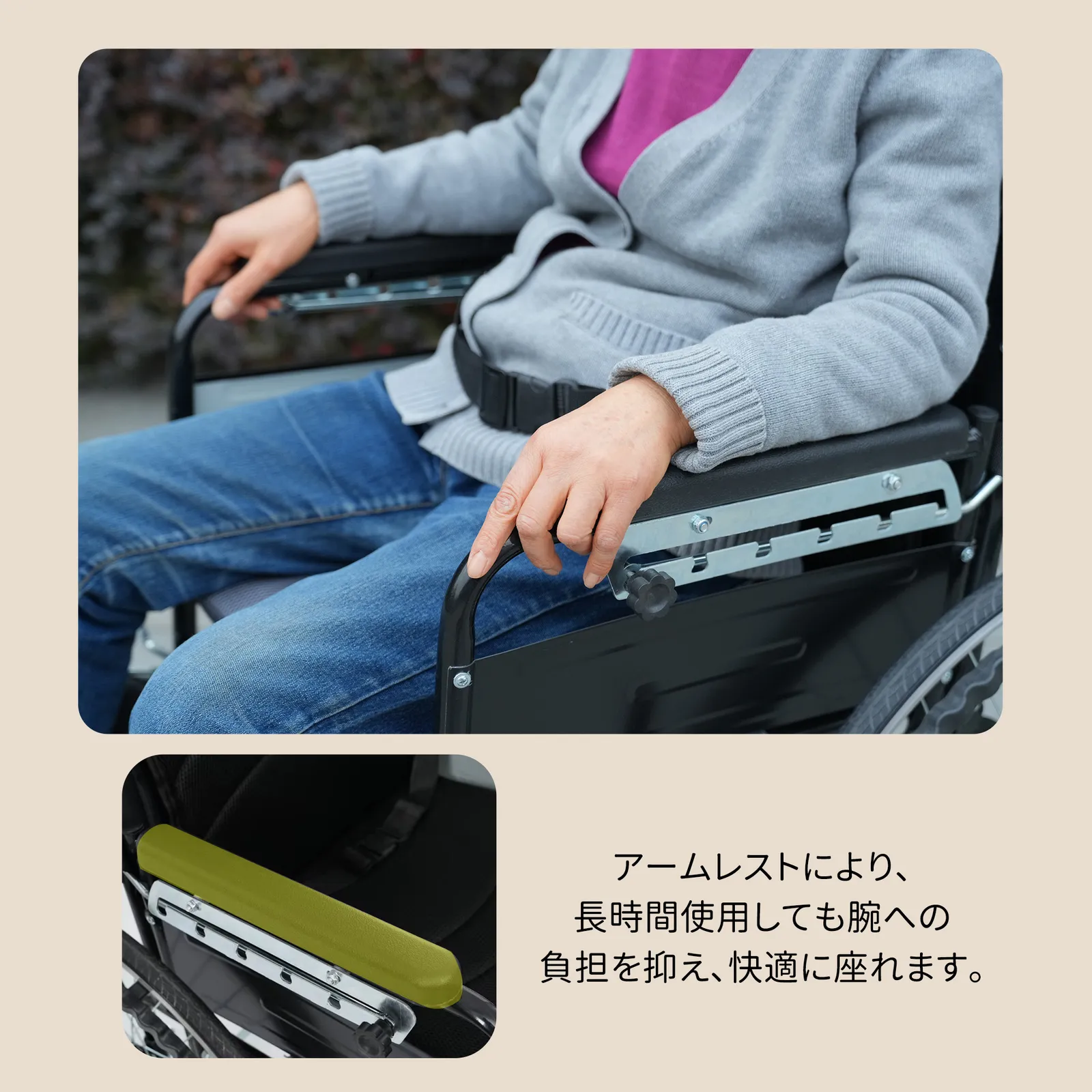 【ハンドブレーキ】走行中の速度調整や停止操作を手元で行え、介助者も安心して操作できます。