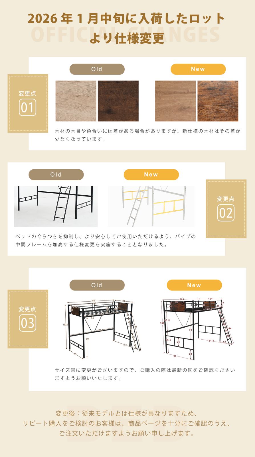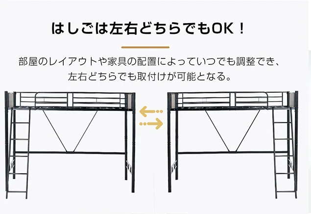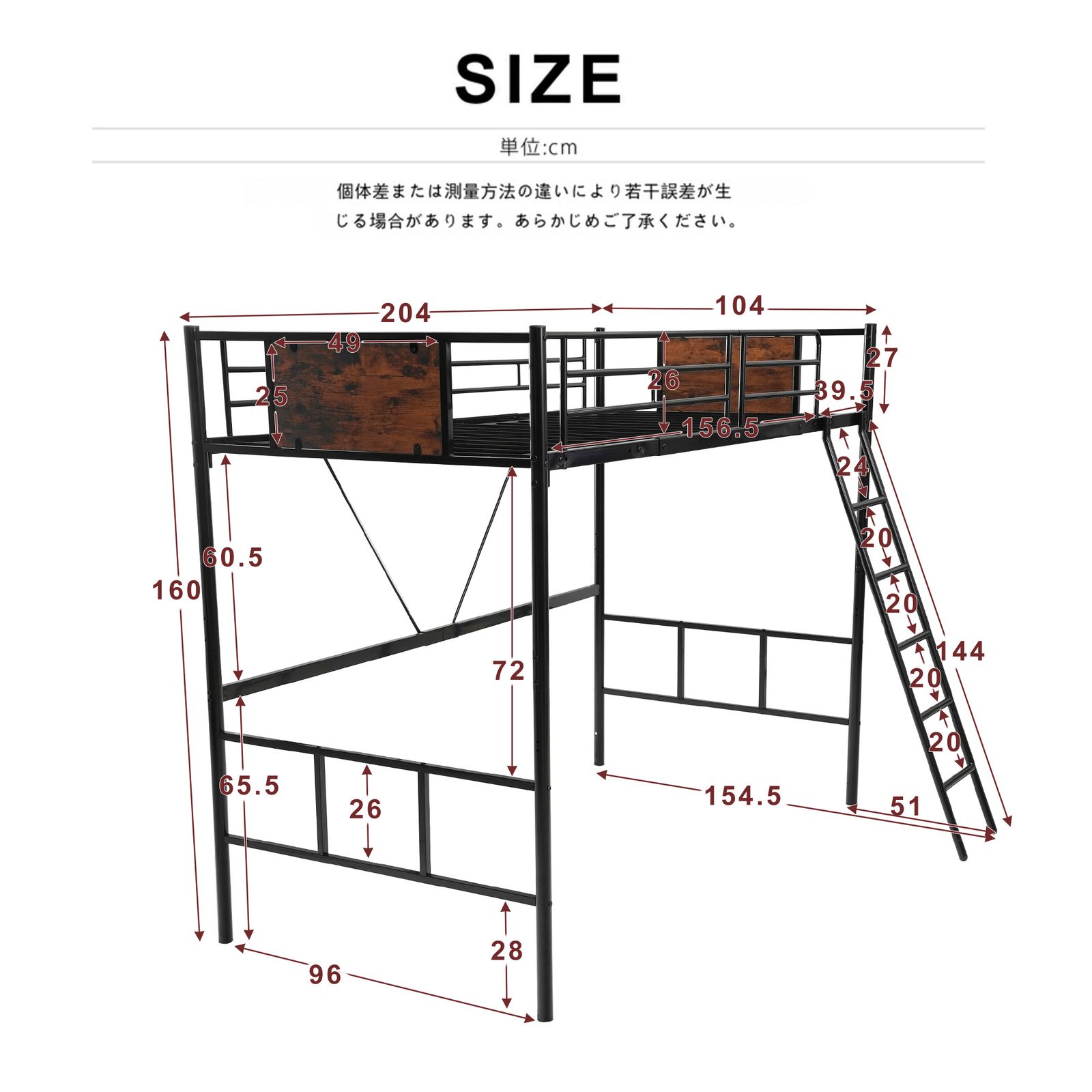 【商品仕様】 ・商品サイズ:幅105×奥行40×高さ152cm(アジャスター範囲) ・重量:15.6kg 天板静止耐荷重:約80KG ラック静止耐荷重:約15KG ・素材:天板: MDF板(メラミン化粧板) フレーム:スチール(水や汚れ、摩擦に強い粉体塗装) ・point1 ・シンプルなデザイン ・木材やスチールフレームを使用したモダンなデザインにより、シンプルな美しさを感じることができます。美しい木目調と純粋な色合いのスチールが組み合わされており、シンプルかつ洗練されたスタイルを体現しています。 ・point2 ・魅力を生む材質 ・MDF素材が使われた天板は、平らで滑らかな表面があり、木の堂々とした重量感と繊細な質感が感じられます。また、高品質で長く安心して使用できます ・point3 2段階高さ調節 ・ベッド下のスペースを自由に使えるのがロフトベッドの最大の魅力!2段調節ができるので好みに合わせてレイアウトやスペースを自由に調整できる。 ・point4 ・ベッド下のスペースを無駄なく有効活用 ・一人暮らしで物を置いていない方や、ワンルームに住んでいる方にぜひおススメのロフトベッド。ベッド下のスペースを無駄にせず、物を収納する場所がないことに悩んでいる方も安心です。収納だけではなく、テーブル、ソファなどの家具を置くこともできる。 ・point5 ・部屋のレイアウトに合わせて、ロフトベッドのはしごの位置を調整することができます。柔軟性のある設計で、限られたスペースでも最適なレイアウトを実現することができます。さらに、安全性にも配慮しており、お子様やお年寄りの方でも使いやすい設計です。 ・point6通気性抜群のフレーム床 ・床全面がメッシュ仕様なので、布団に湿気がこもりにくく、通気性がいいので、カビにも強い! ・ご確認ください ・こちらの商品はお客様で組み立てていただく商品です ・"※大人3名以上 ・組み立ての際は、必ず大人3名以上で行ってください。時間の目安は大人3名以上で約180分です。" ・"※電動ドライバーが必要です ・付属工具とお手持ちのプラスドライバーで組み立てお願います。多くのネジとめが必要となりますので電動ドライバーなどがあると便利です。" ※シート張り商品について ・リアルな木目調シートを採用しています。木目や節、傷に見えるようなものシートのデザインとなりますので、シートを理由とした返品?交換は行なっておりません。予めご了承ください。 ・サイズ 外寸:長さ206×幅104.5×高さ160.5cm ・上段:ベッド部内寸:199cm ・下段:ベッド部内寸:196.5cm ・支柱の太さ:直径38mm ・重量 約47kg ・耐荷重 1段あたり約120kg ・素材 スチール(塗装仕上げ) ・天板: MDF板(中密度繊維版) ・カラー ブラック、ホワイト ・生産国 中国 ・組み立て お客様組み立て(3名以上約180分)
