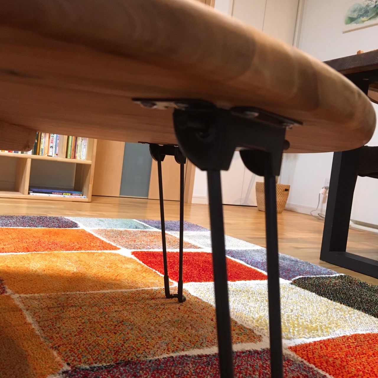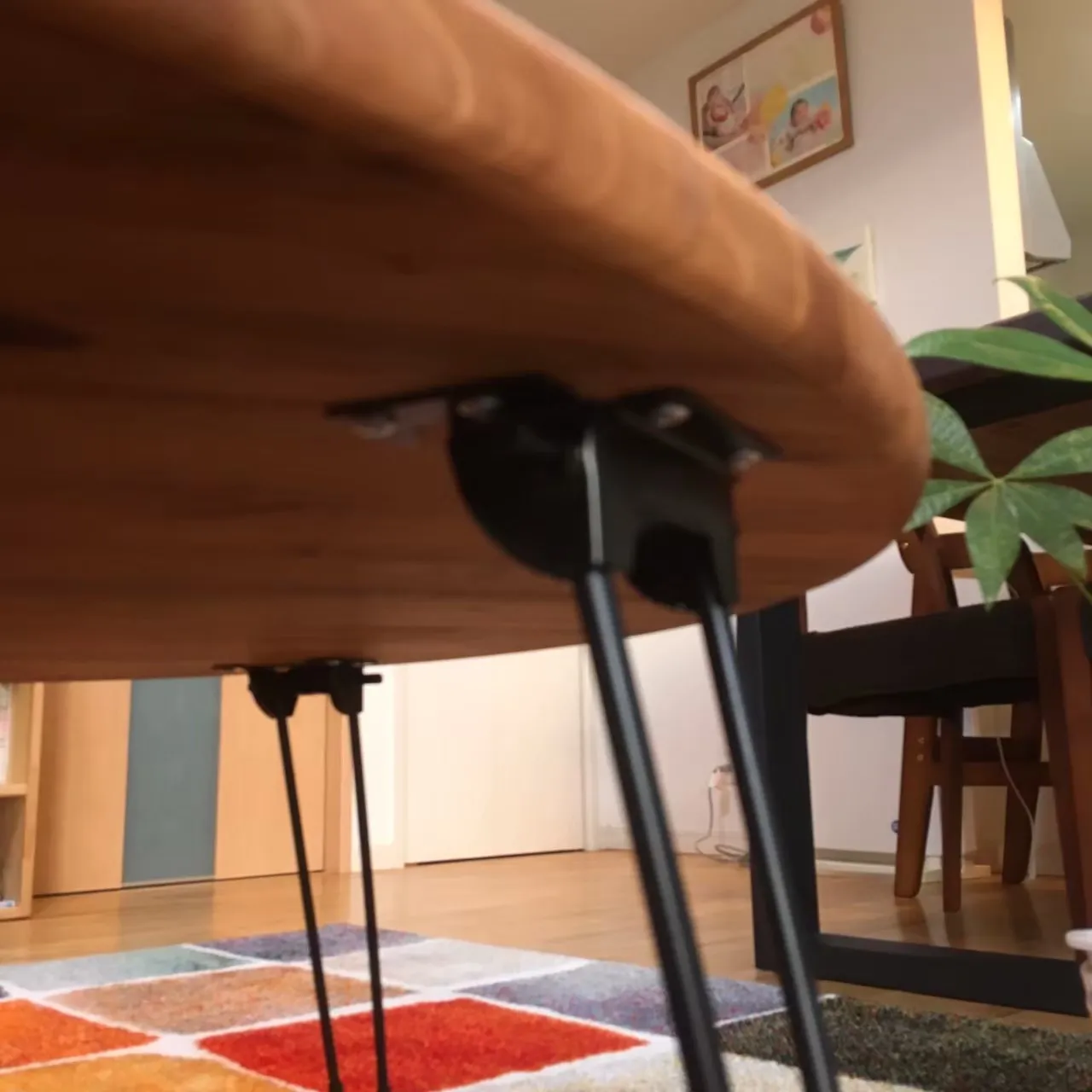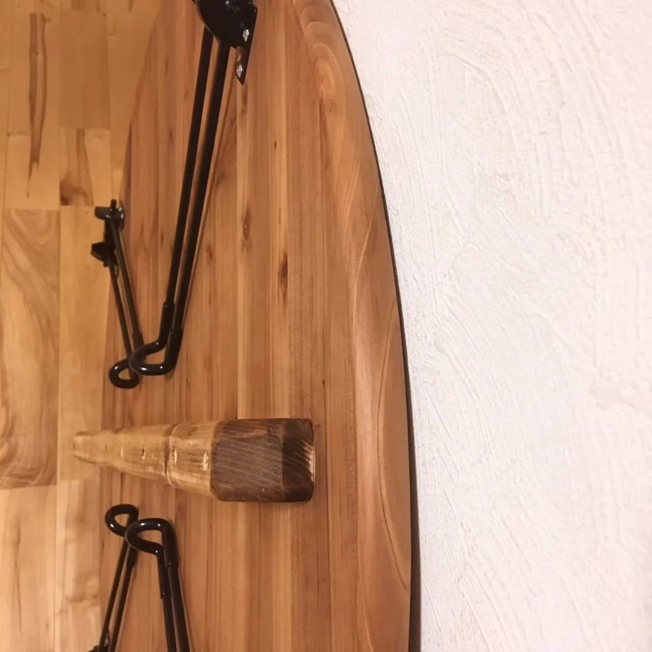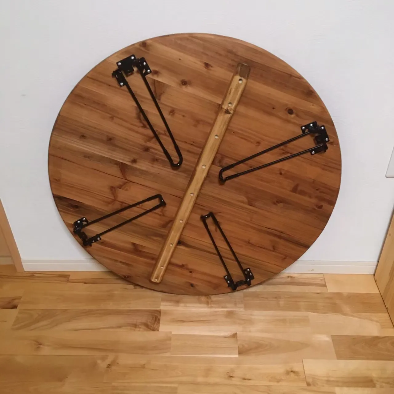 ◆脚 つや消しブラックスチールのスリムな折り畳み脚を使用。 木製脚の丸テーブルもございます。