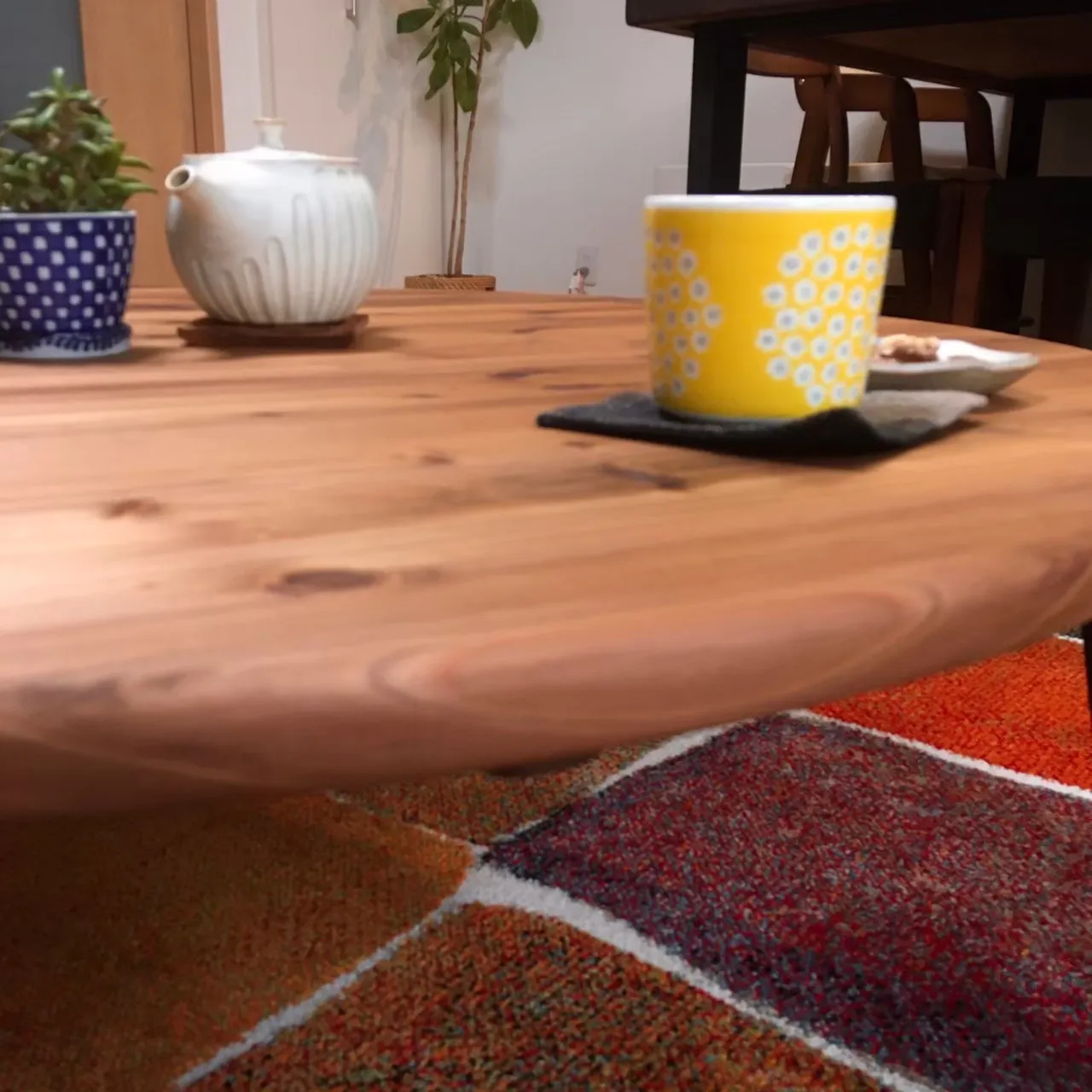 ◆商品コンセプト 昔から日本で馴染みのあるちゃぶ台。 どこに座ってもみんなの顔が見え、自然と人が集まってきやすい丸いフォルムが特徴です。 そのアットホームな雰囲気に、優しさとオシャレな存在感を感じられる無垢材のちゃぶ台を製作しました。 お子様がいらっしゃるご家庭も安心してご利用頂けるよう、全て手作業で天板の円周から脚の部分まで全ての角を丸く仕上げております。 手に取ったお客様がつい触っていたくなるような お子様がいるご家庭でも安心して使えるような そんな仕上がりを目指しています。 比較的軽量で、女性一人でも余裕をもって移動して頂くことが可能。 杉材は節がございます。 節の抜け部分は職人が丁寧に埋めて平らに仕上げております。 節が自然なアクセントに♪ 尚、柔らかい肌触りで木目も綺麗な杉材ですが、傷もつきやすい木材です。 長く使っていただく中で、お客様の生活の跡と考えて頂き、味わいとして楽しんでいただければ幸いです♪