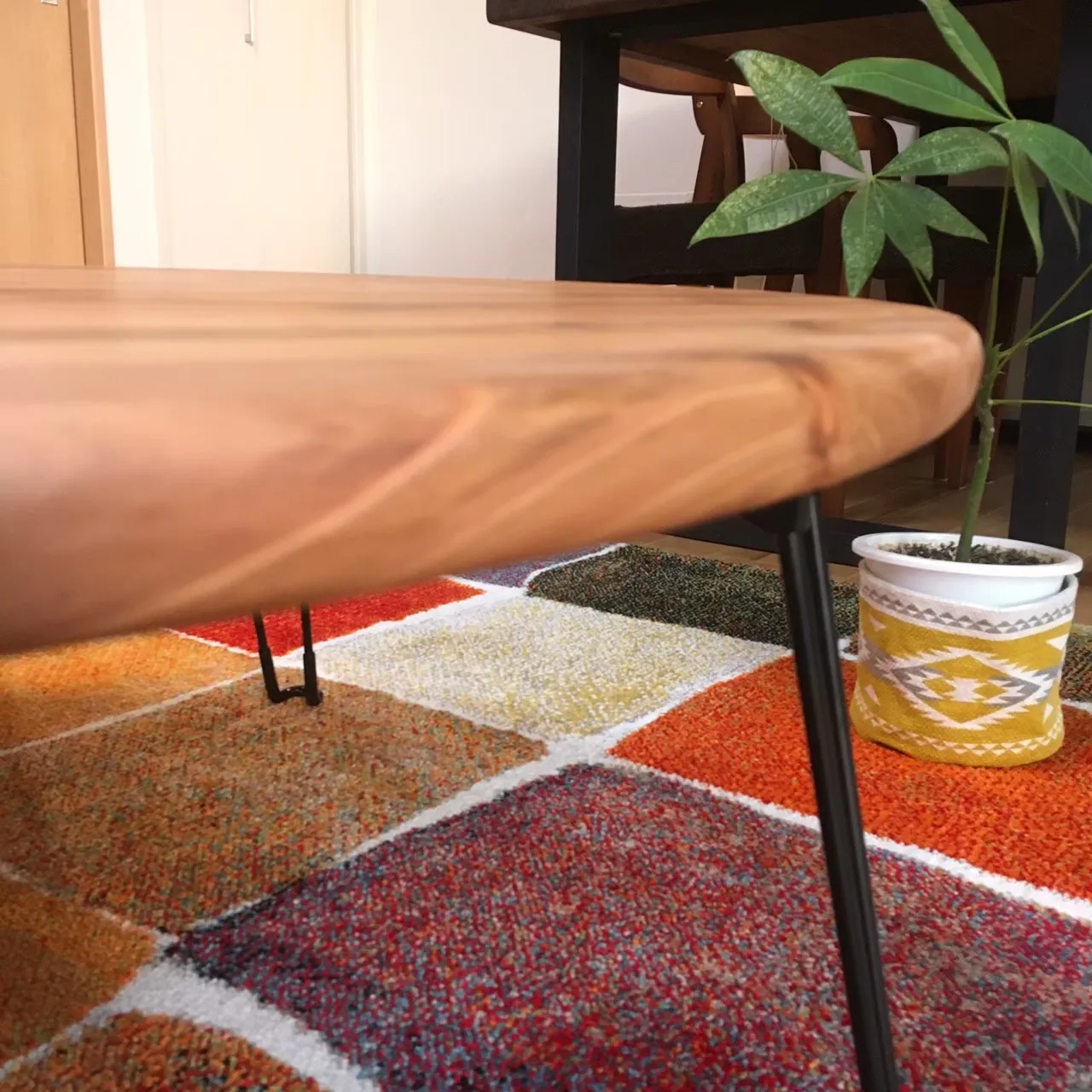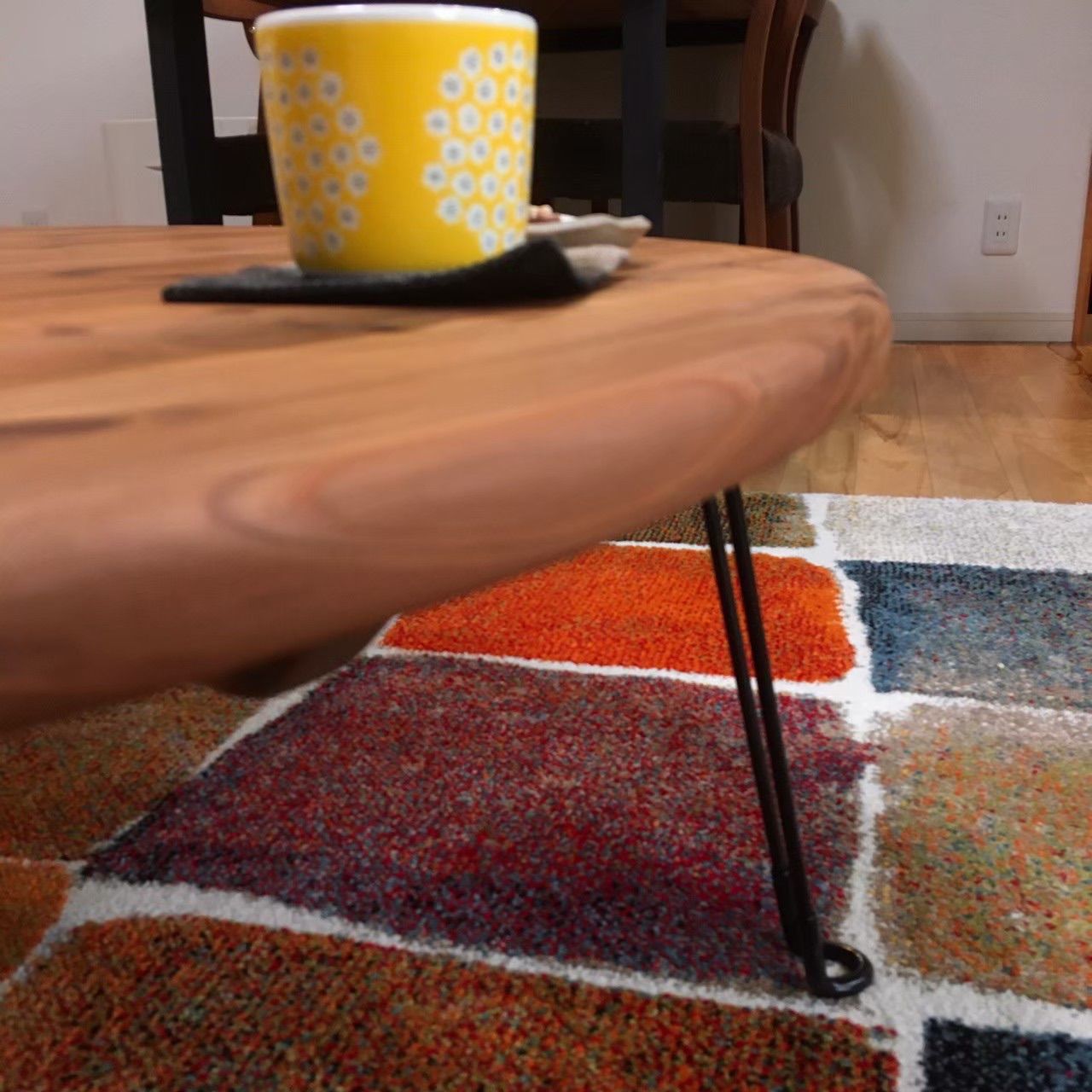 ◆商品タイトル つい触りたくなる国産杉のちゃぶ台~スチール脚~ (ミディアムウォルナット)(直径90㎝)