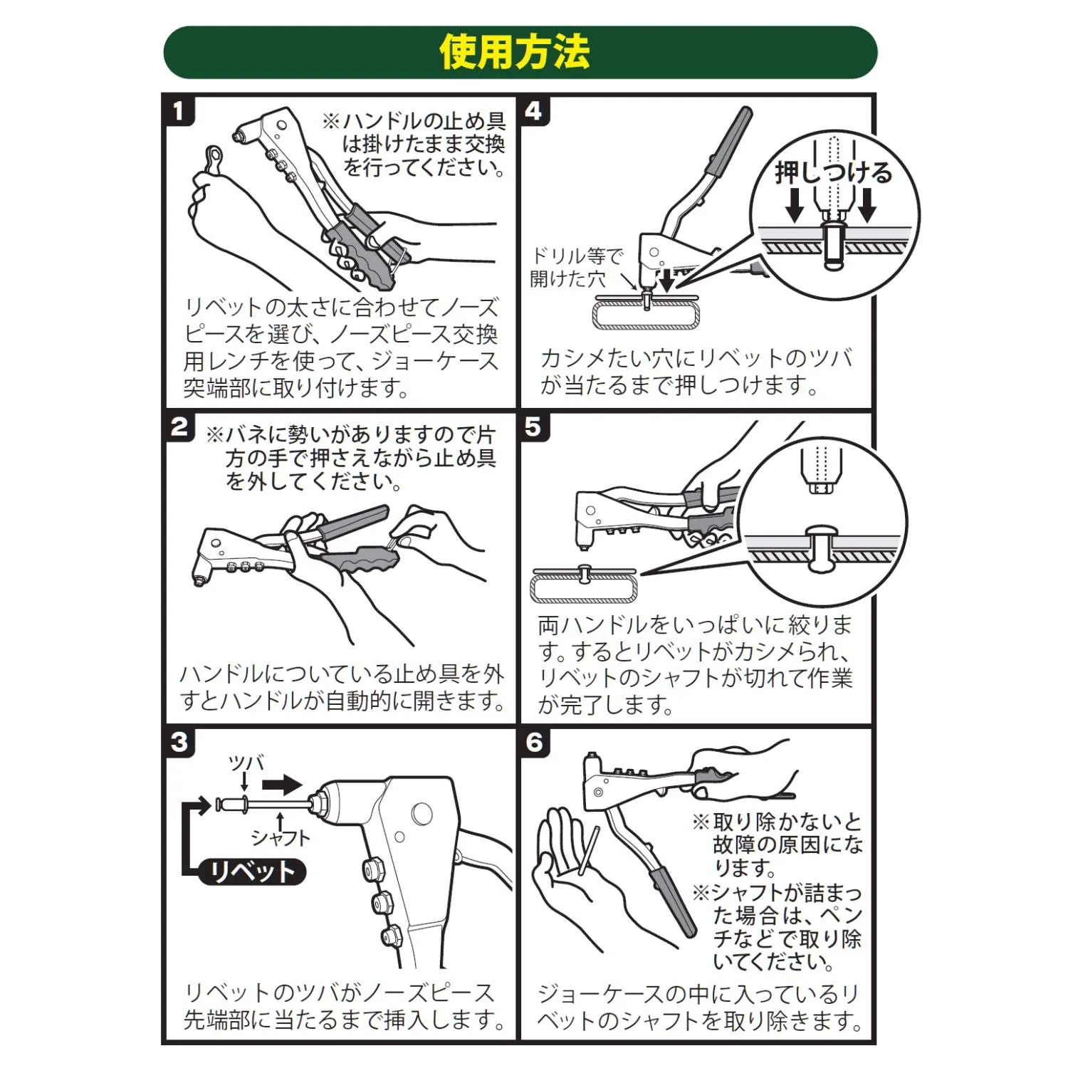 セット内容:ハンドリベッタ本体/1個、ノーズピース(2.4mm、3.2mm、4.0mm、4.8mm用)各1個、アルミ製ブラインドリベット(2.4mm、3.2mm、4.0mm、4.8mm)各15本、ノーズピース交換用レンチ/1個