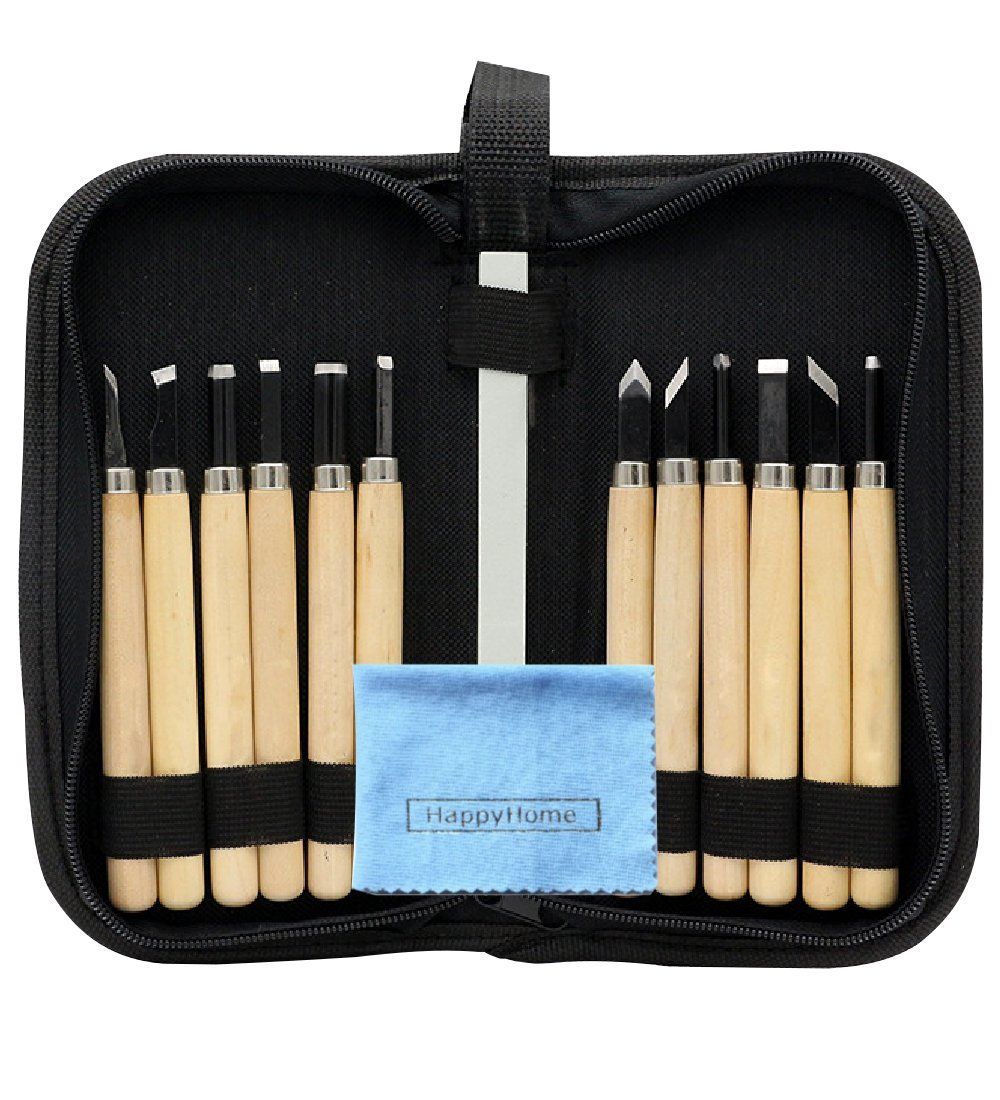 HappyHome 彫刻刀 12本 セット 砥石付き 収納ケース クリーニングクロス付き 木彫り 木工道具