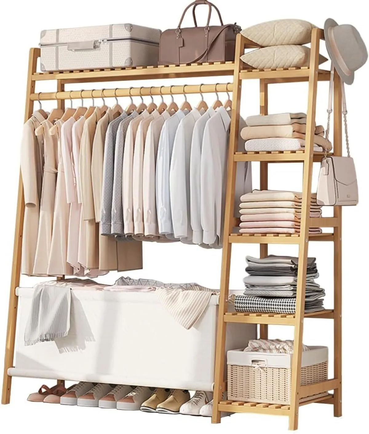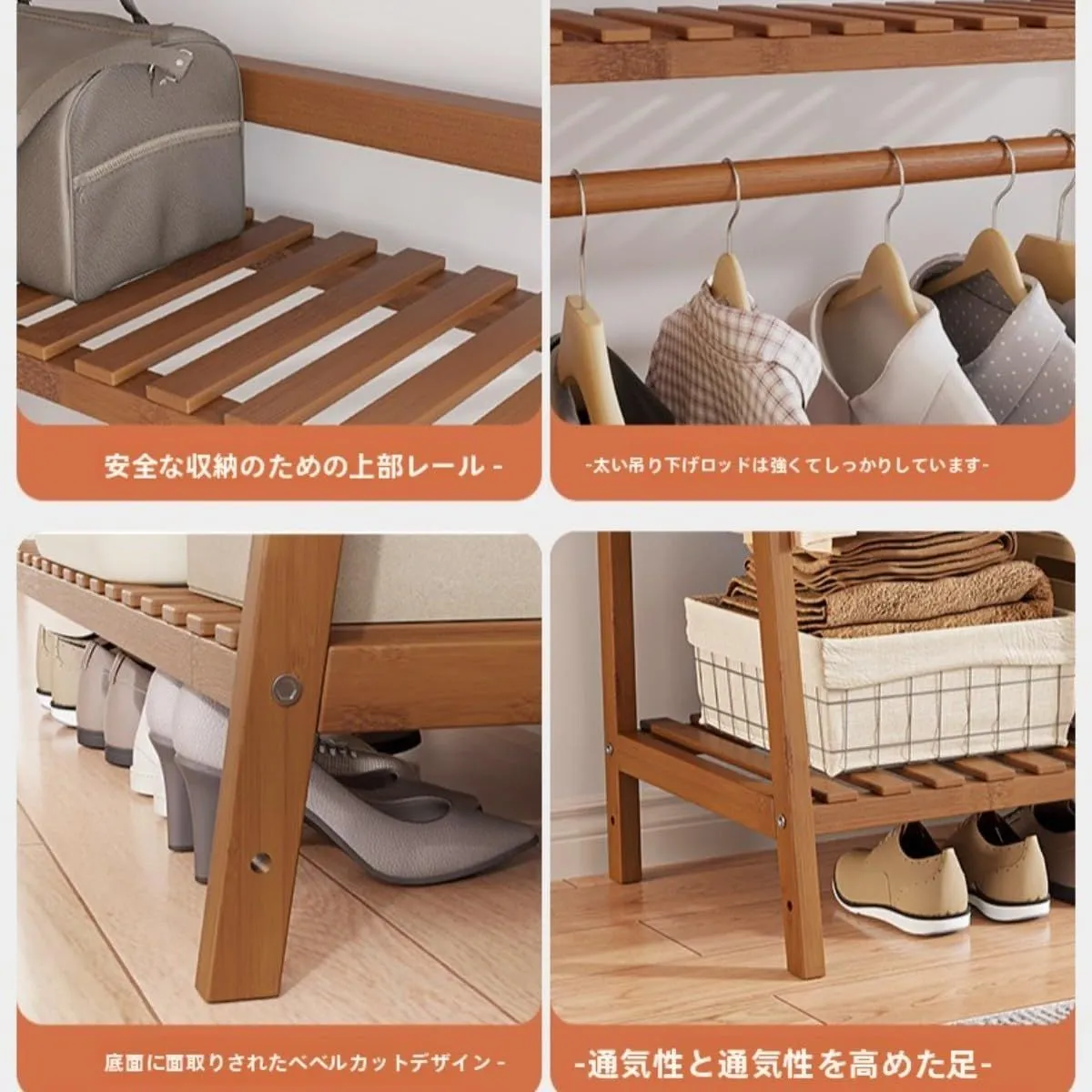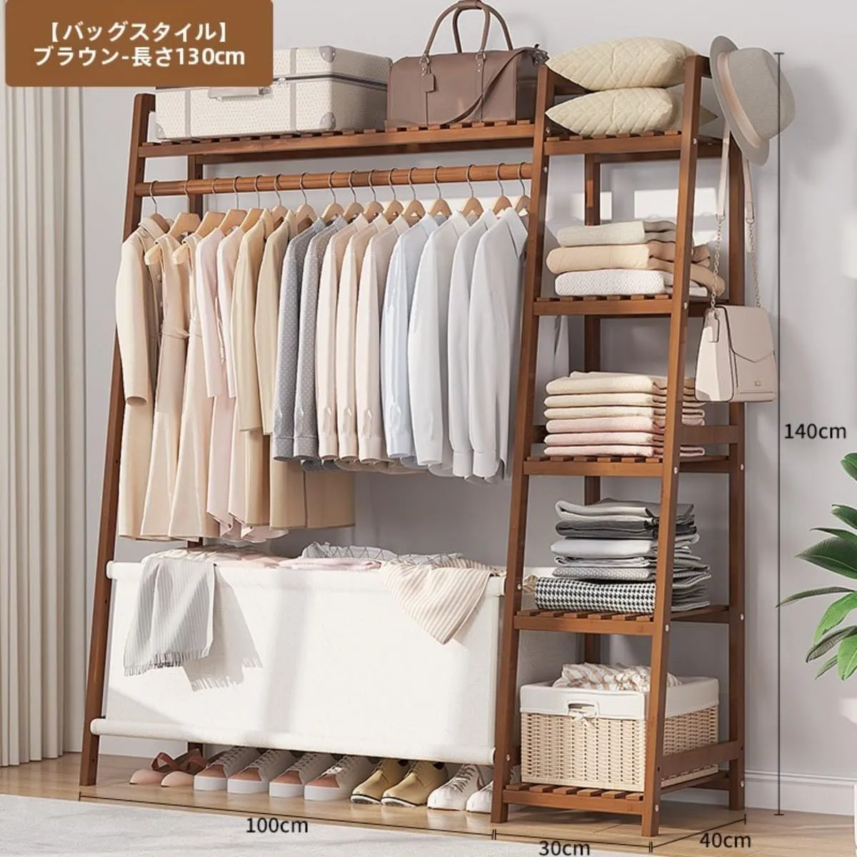 ハンガーラック 木製 ワードローブ 洋服ハンガー コート掛け 物干しスタンド 自立型 多機能 天然竹製 収納ラック 頑丈 大容量 室内 玄関 子供部屋用 省スペース 衣類整理 (110CMB)