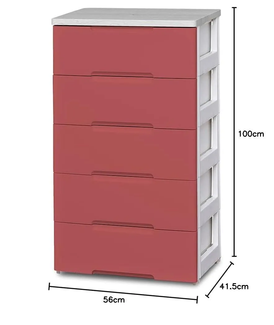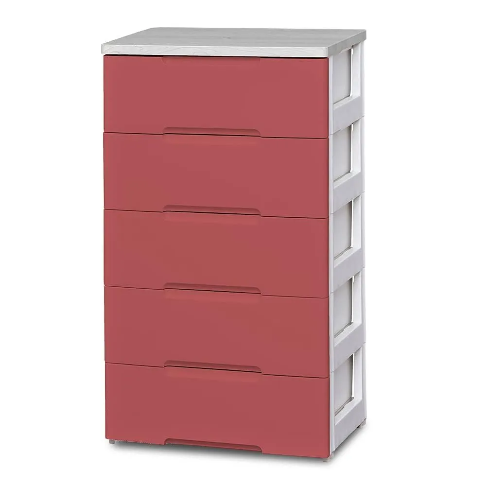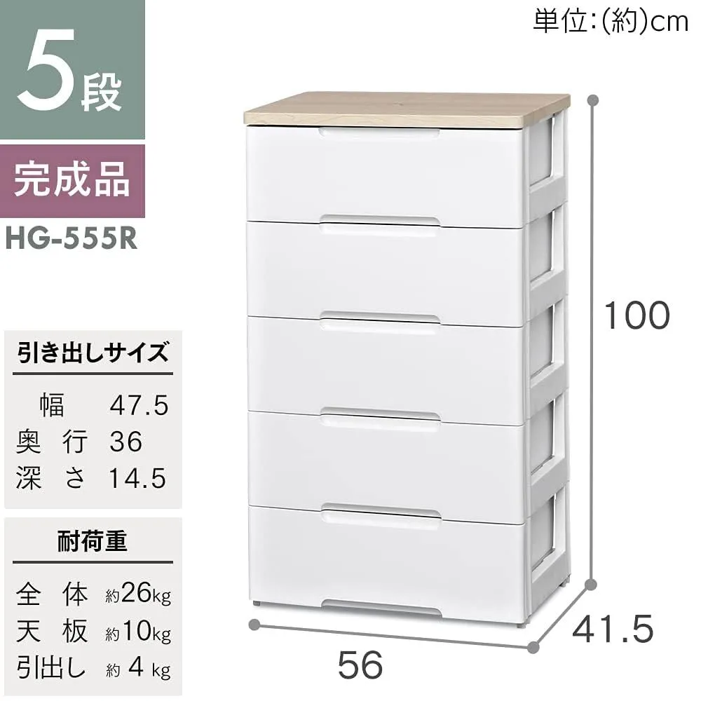 チェスト 5段 届いてすぐ使える完成品 木天板 プラスチック 収納ケース 幅56×奥行41.5×高さ100cm 引き出し ウッドトップチェスト 組立不要(スモーキーレッド) HG-555R