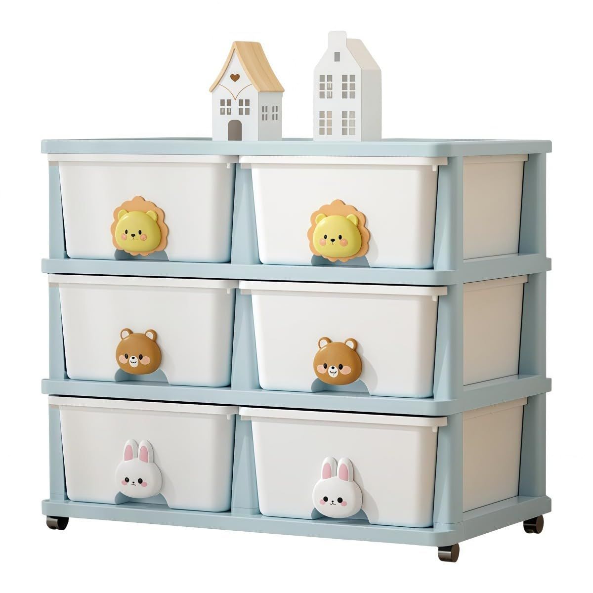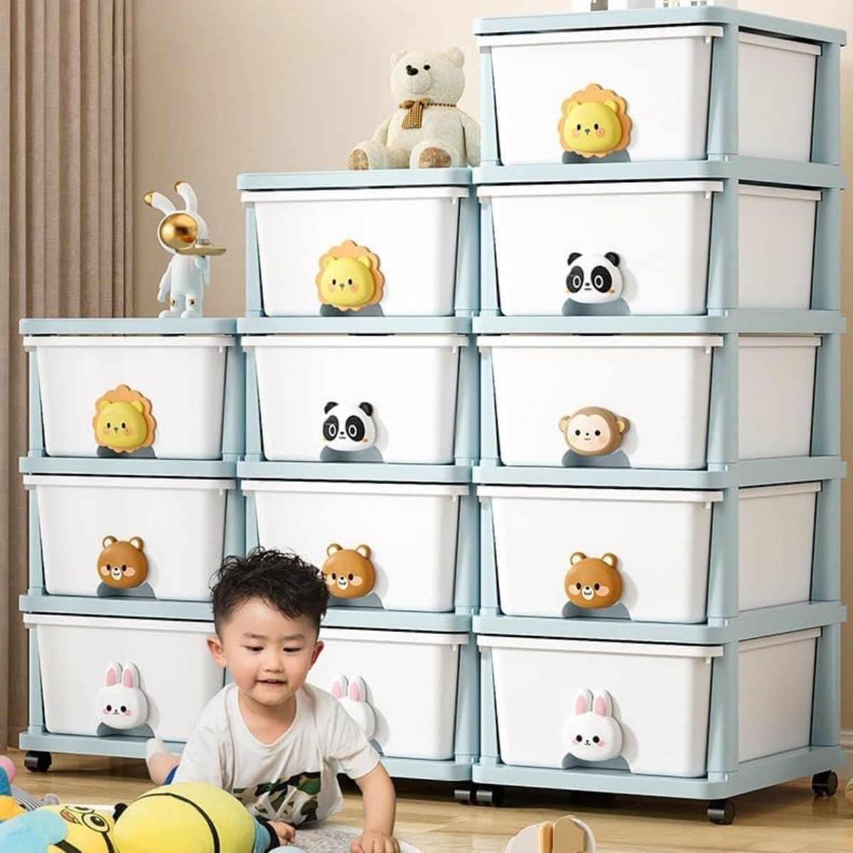 この子供服の収納ボックスは、青と白のプラスチックで作られており、スタイリッシュなデザインと美しさがあり、子供部屋に適しています。収納ボックスには2/3/4/5/6層の引き出しがあり、それぞれにユニークなカートゥーン動物のパターンの保護カバーがあり、子供たちに楽しさと相互作用をもたらします。