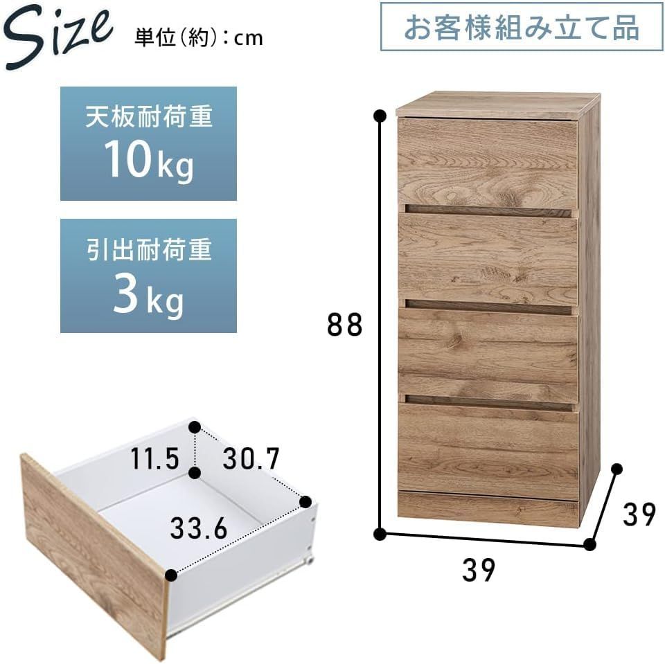 商品サイズ(cm):[本体外寸]幅約39×奥行約39×高さ約88[引き出し内寸]幅約30.7×奥行約33.6×高さ約11.5 / 商品重量:約20.4kg 耐荷重:[全体]約22kg[天板]約10kg[引き出し(1個あたり)]約3kg(※耐荷重は測定値であり、値ではありません。) 主要材質:[正面、天面、側面]プリント紙化粧パーティクルボード[後面]プリント紙化粧繊維板 必要工具:+ドライバー(サイズ:2番) / ※2人での組み立てをおすすめします。 / ※インパクトドライバーは使用しないでください。破損するおそれがあります。