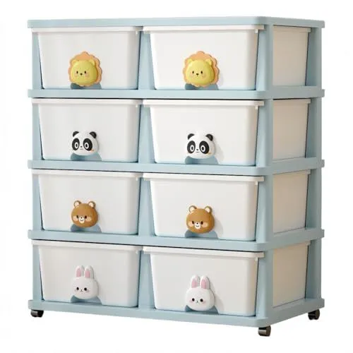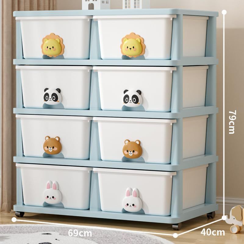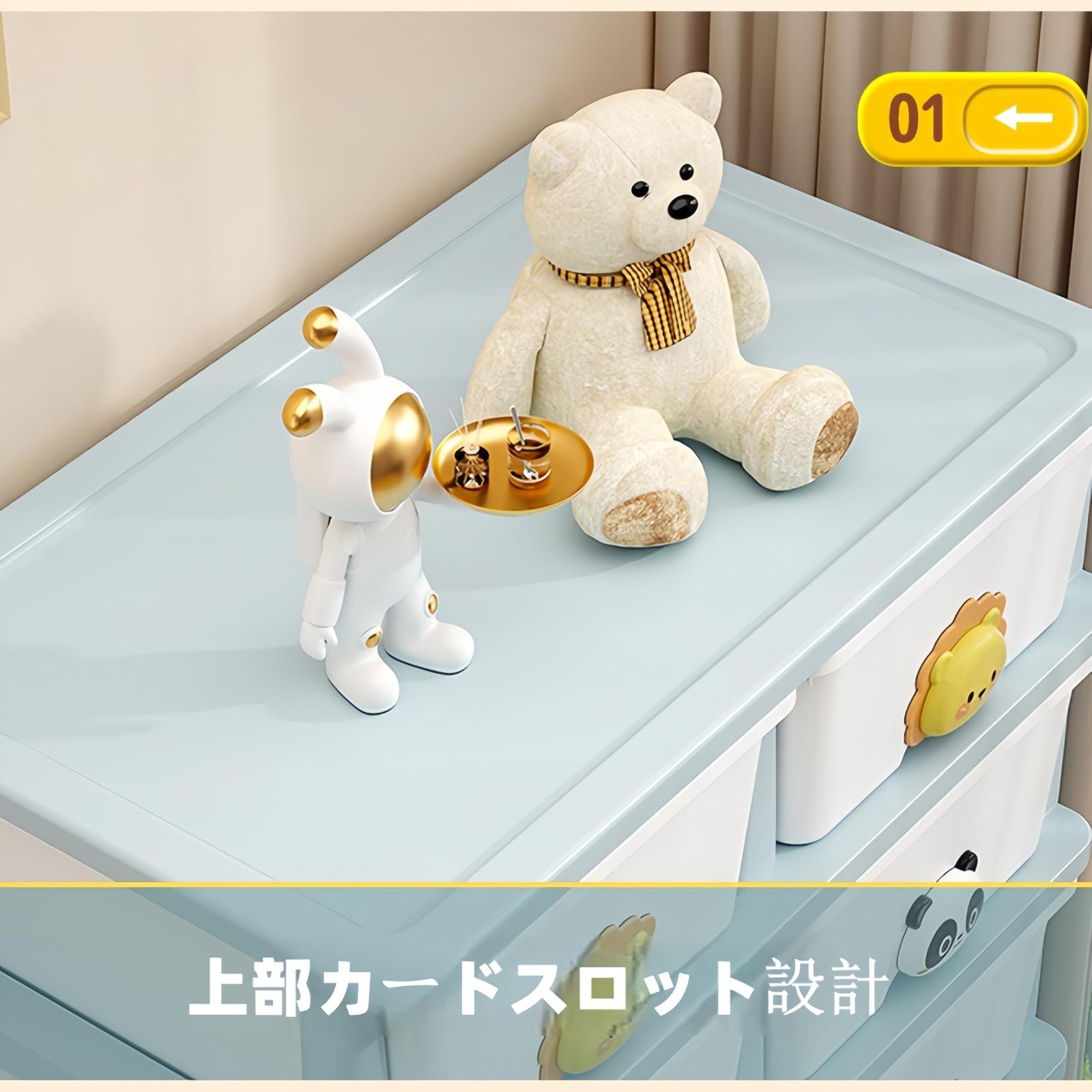 この子供服の収納ボックスは、青と白のプラスチックで作られており、スタイリッシュなデザインと美しさがあり、子供部屋に適しています。収納ボックスには2/3/4/5/6層の引き出しがあり、それぞれにユニークなカートゥーン動物のパターンの保護カバーがあり、子供たちに楽しさと相互作用をもたらします。