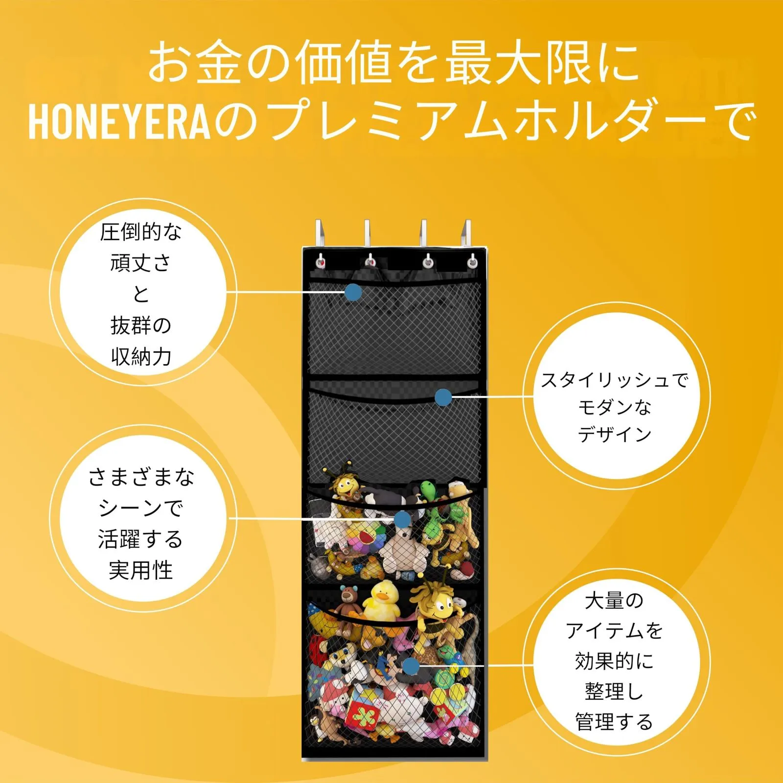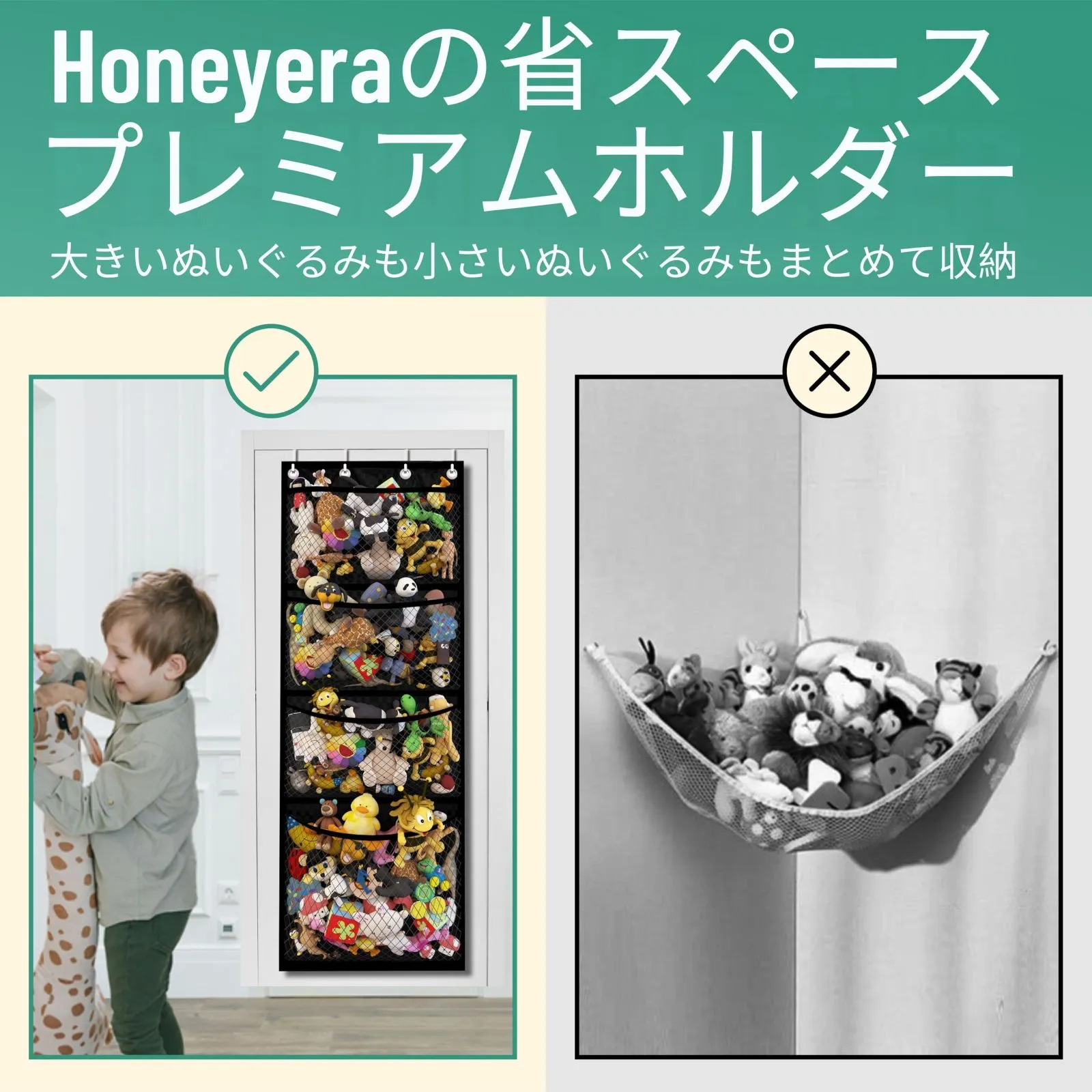 Honeyera(ハネラ) ぬいぐるみ収納 - ドア越しオーガナイザー スタッフィー ベビーアクセサリー おもちゃのぬいぐるみ収納/簡単な取り付け 吊り下げ式収納ポケット付き (黒)