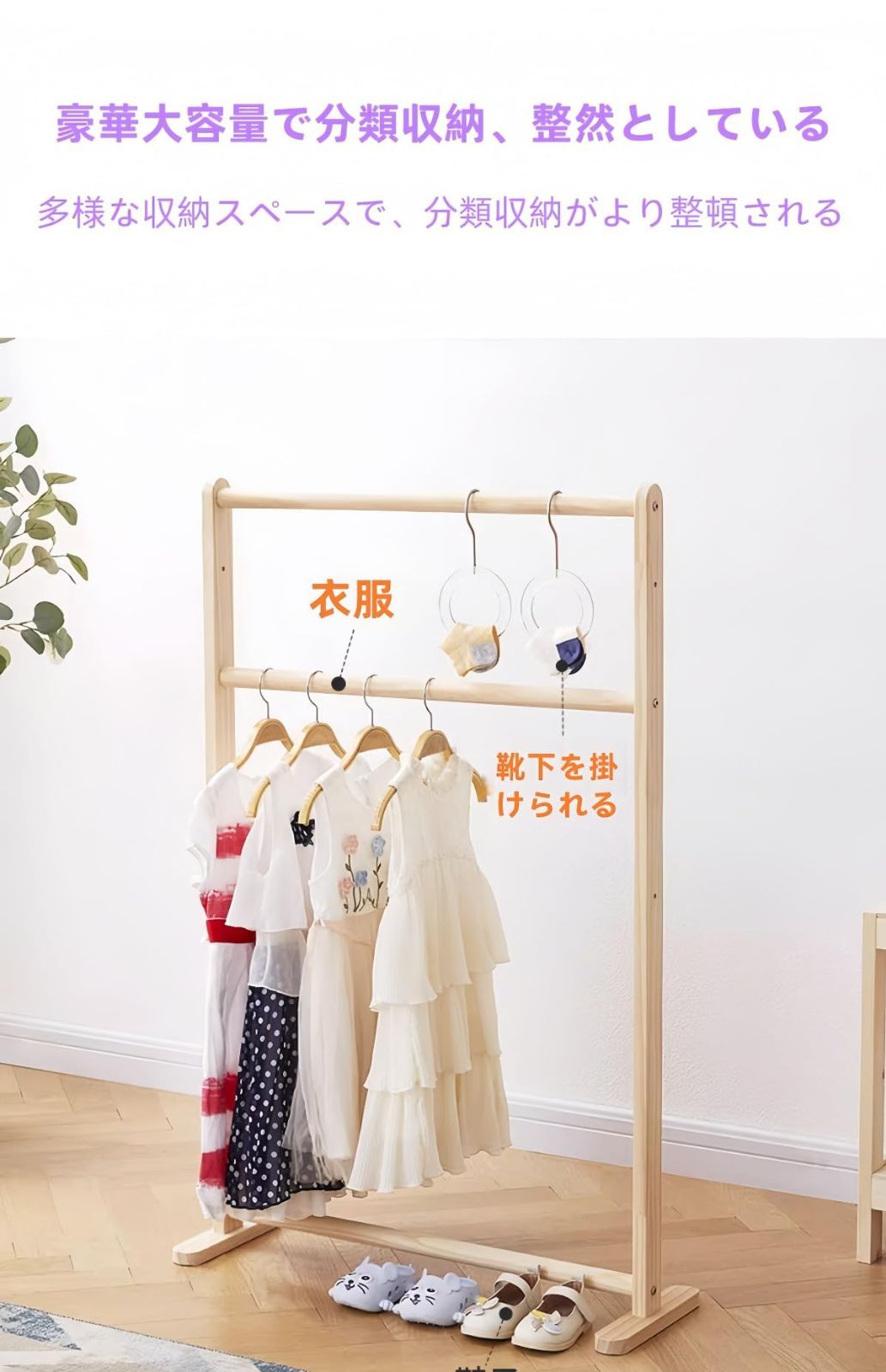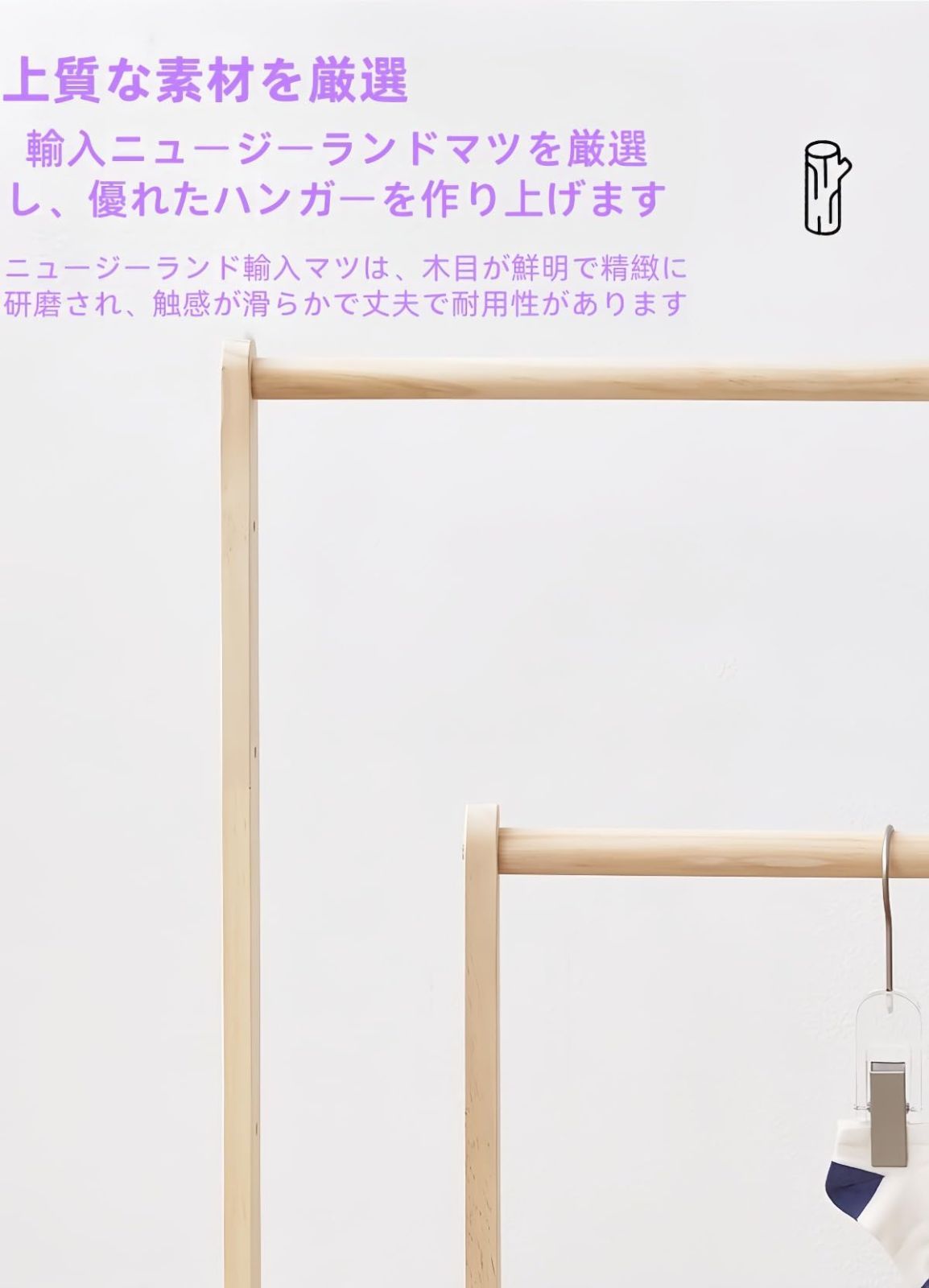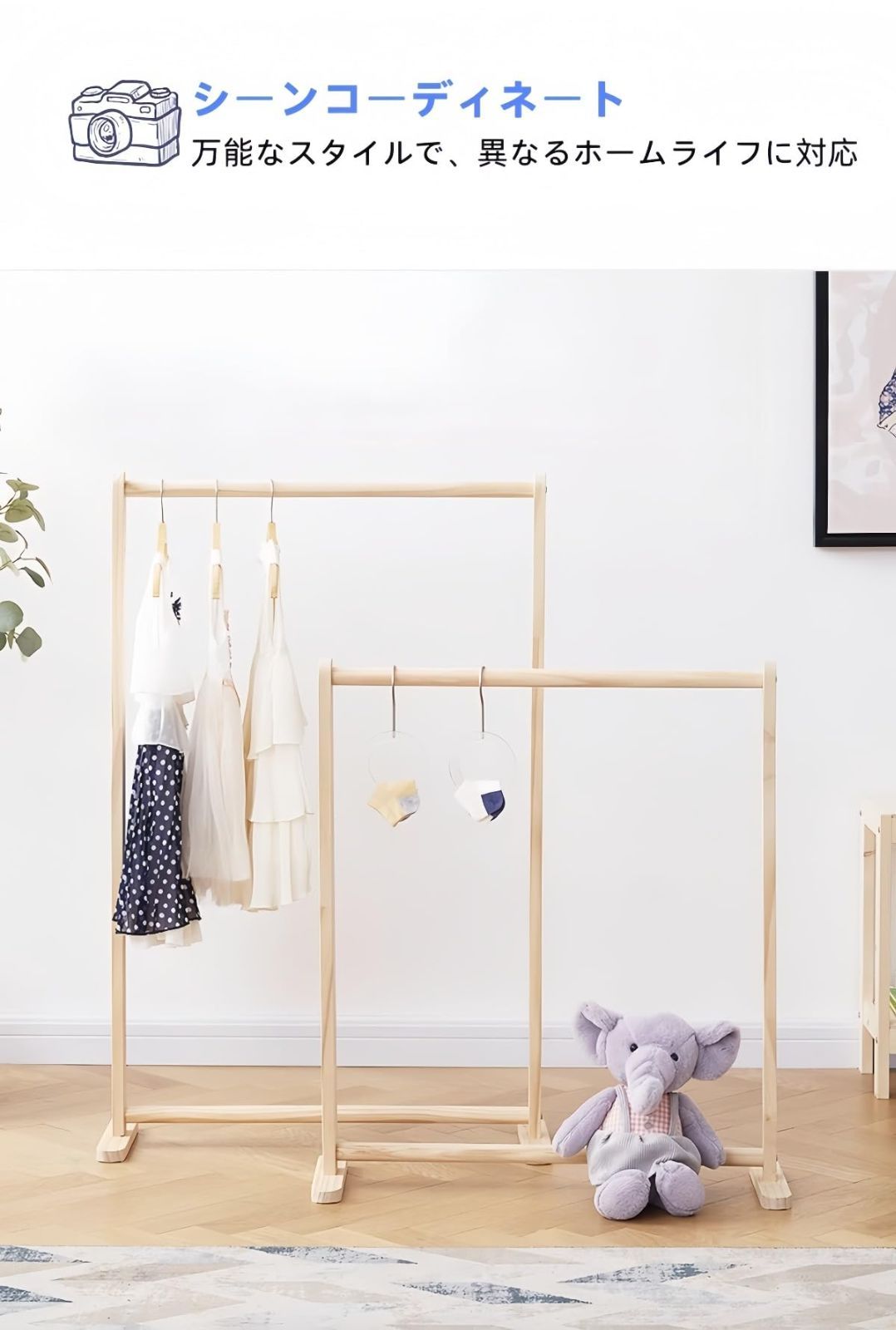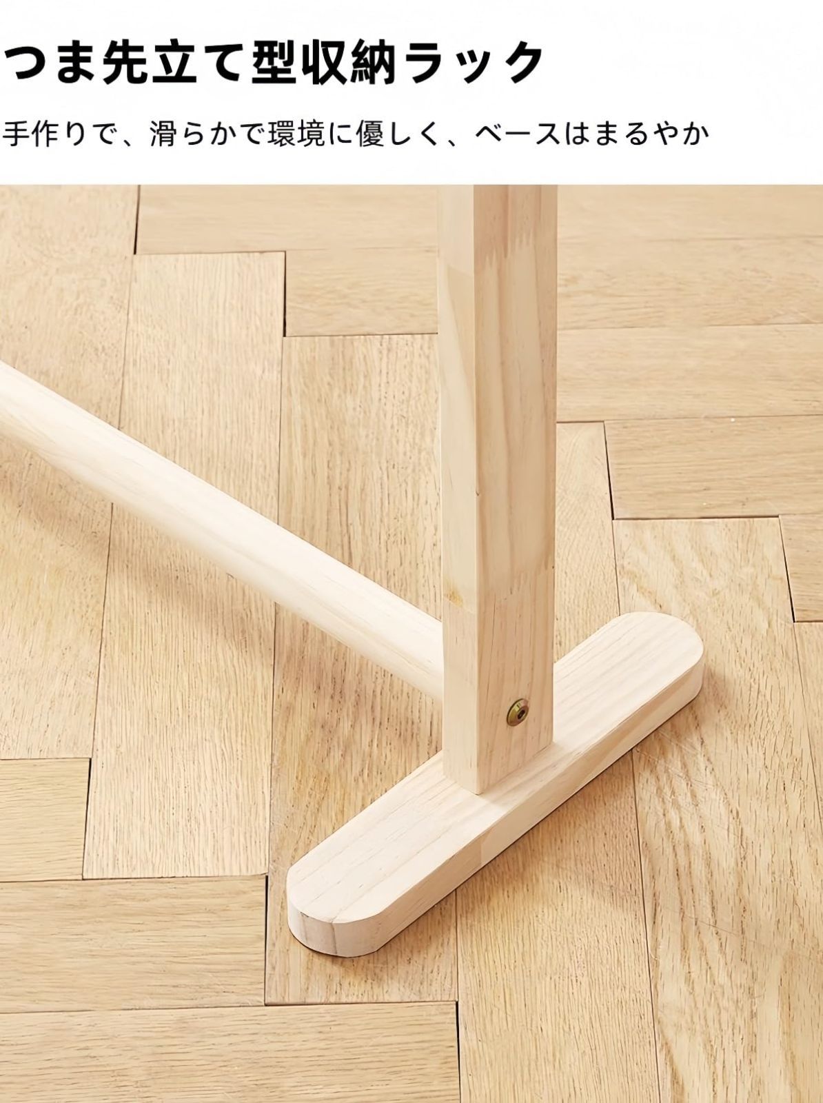 天然木を使用した高品質のハンガーラックは、温かみのある雰囲気で、どんなインテリアにも適しています。