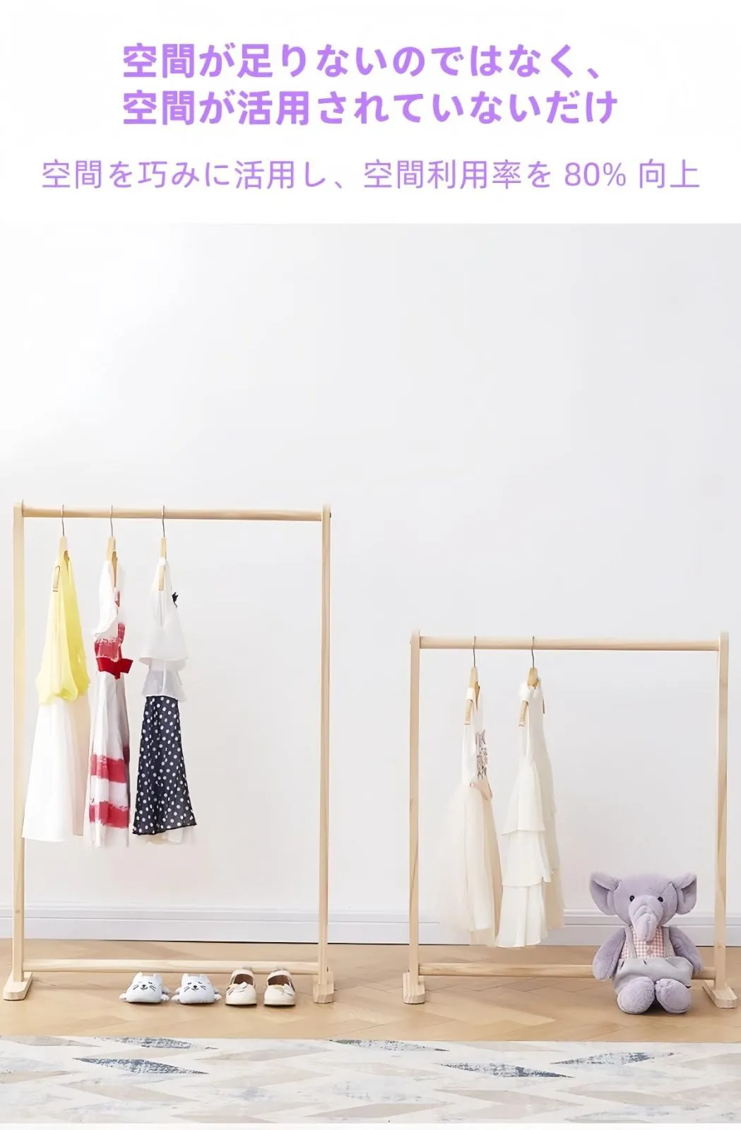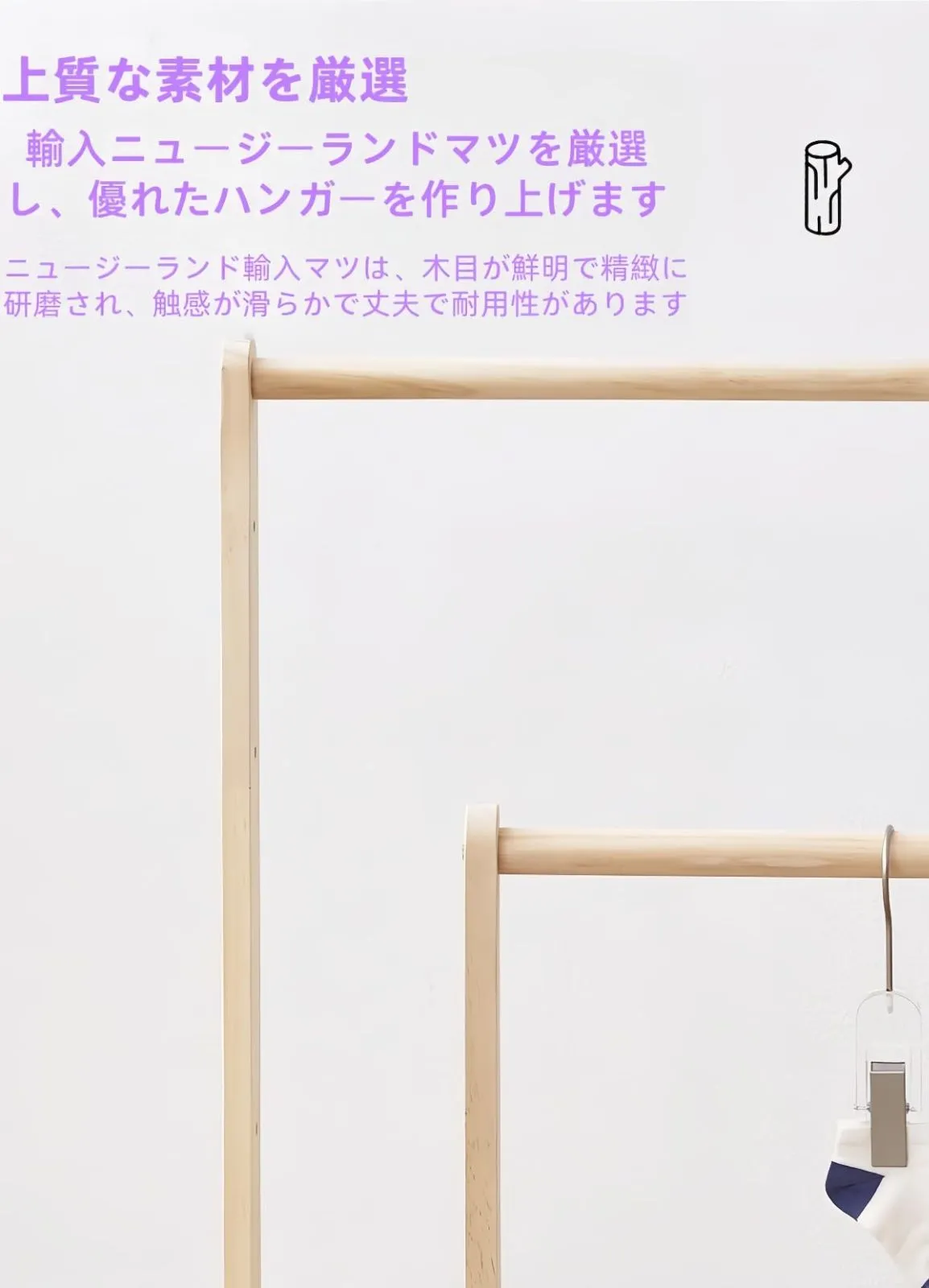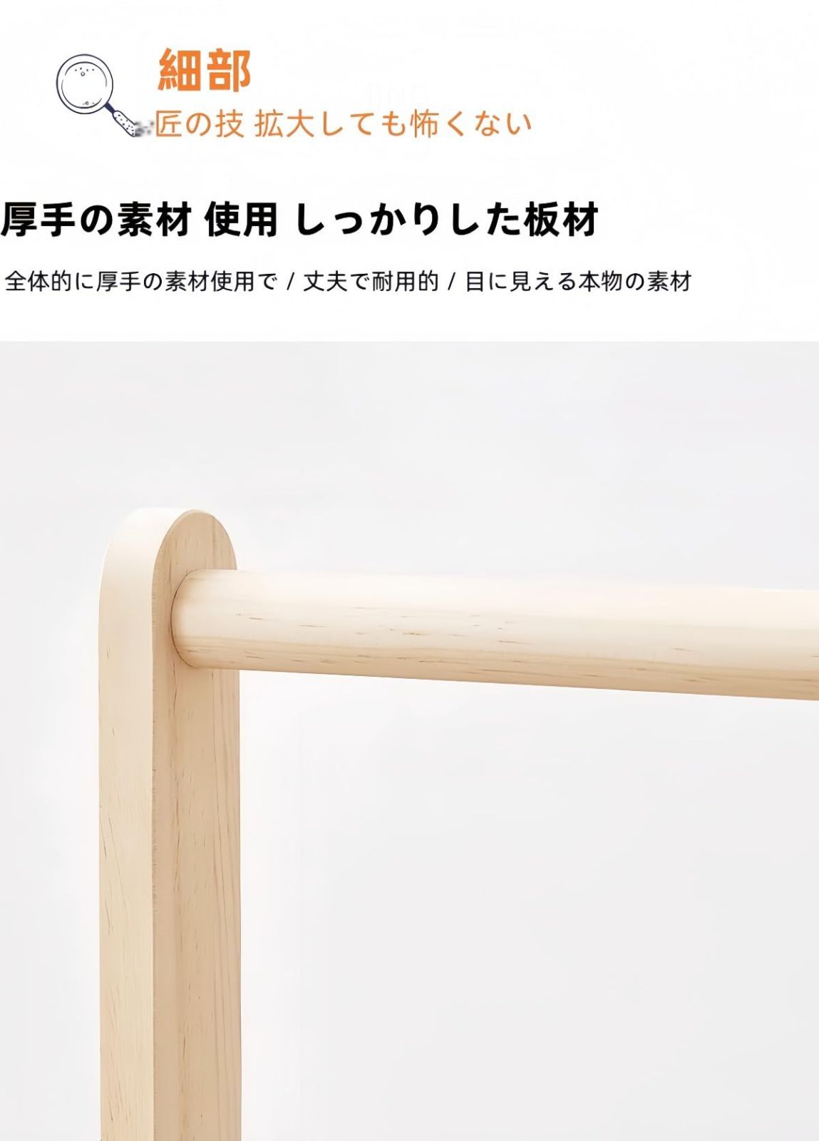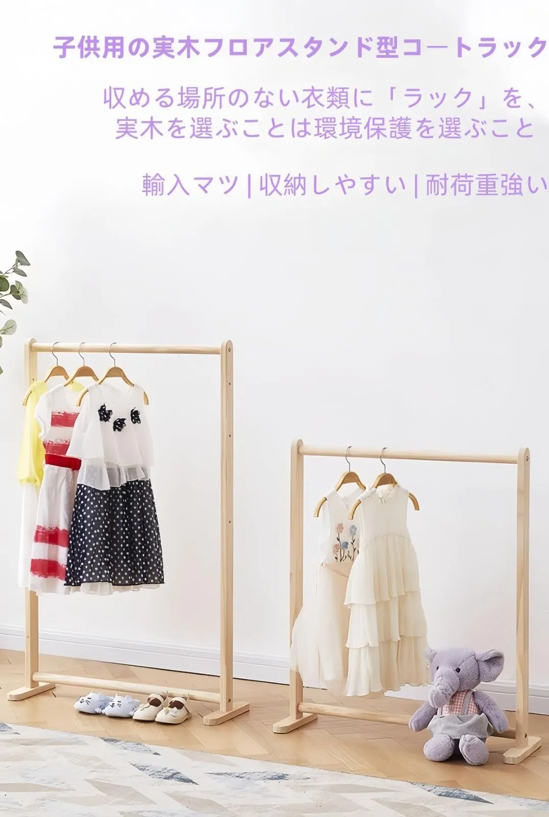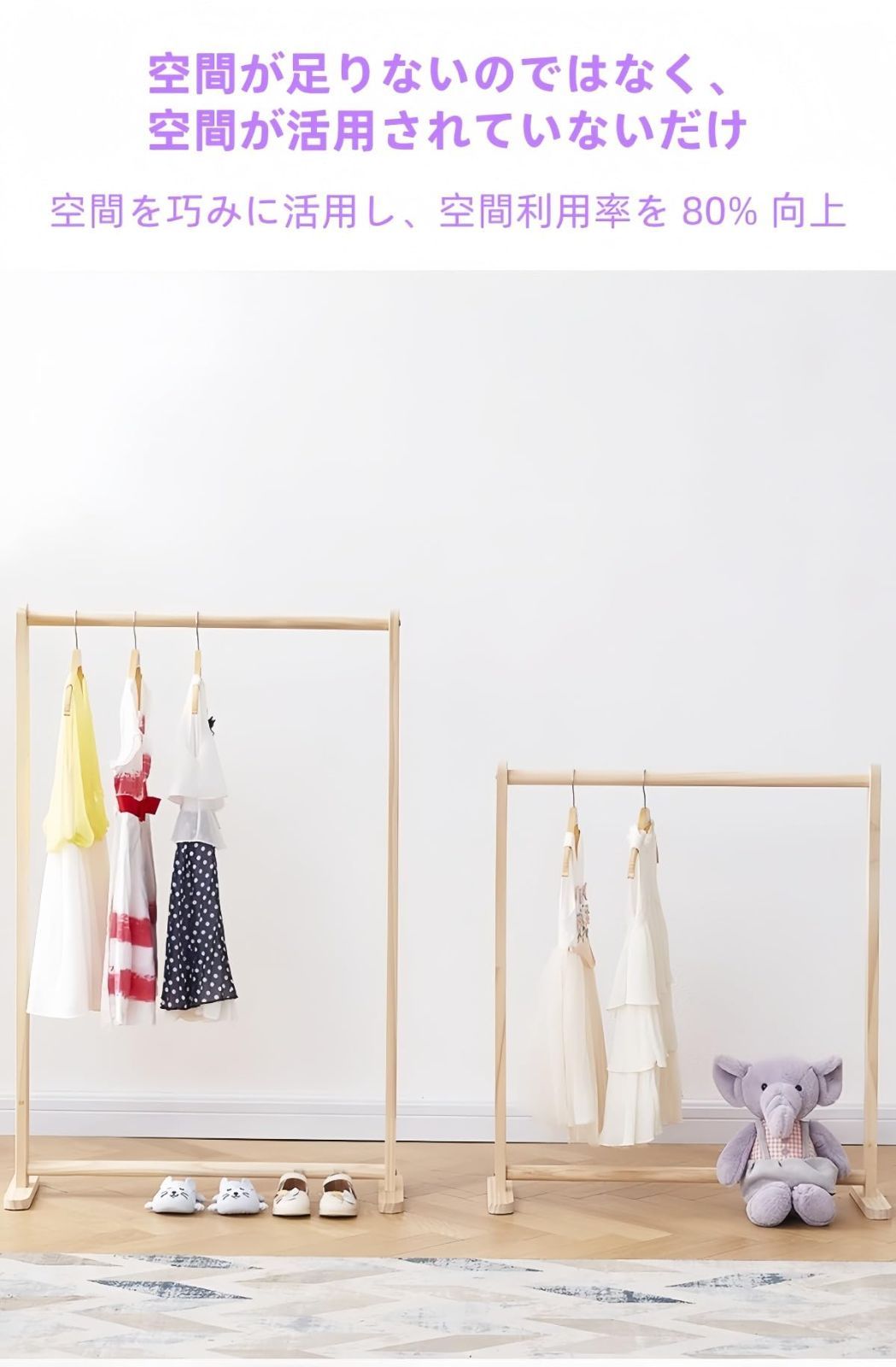 天然木を使用した高品質のハンガーラックは、温かみのある雰囲気で、どんなインテリアにも適しています。