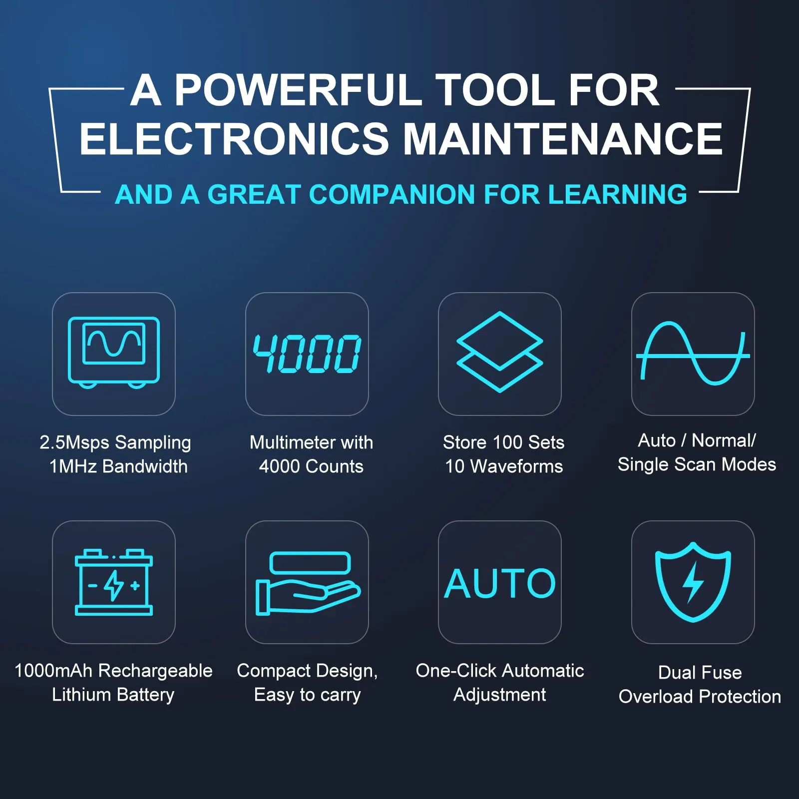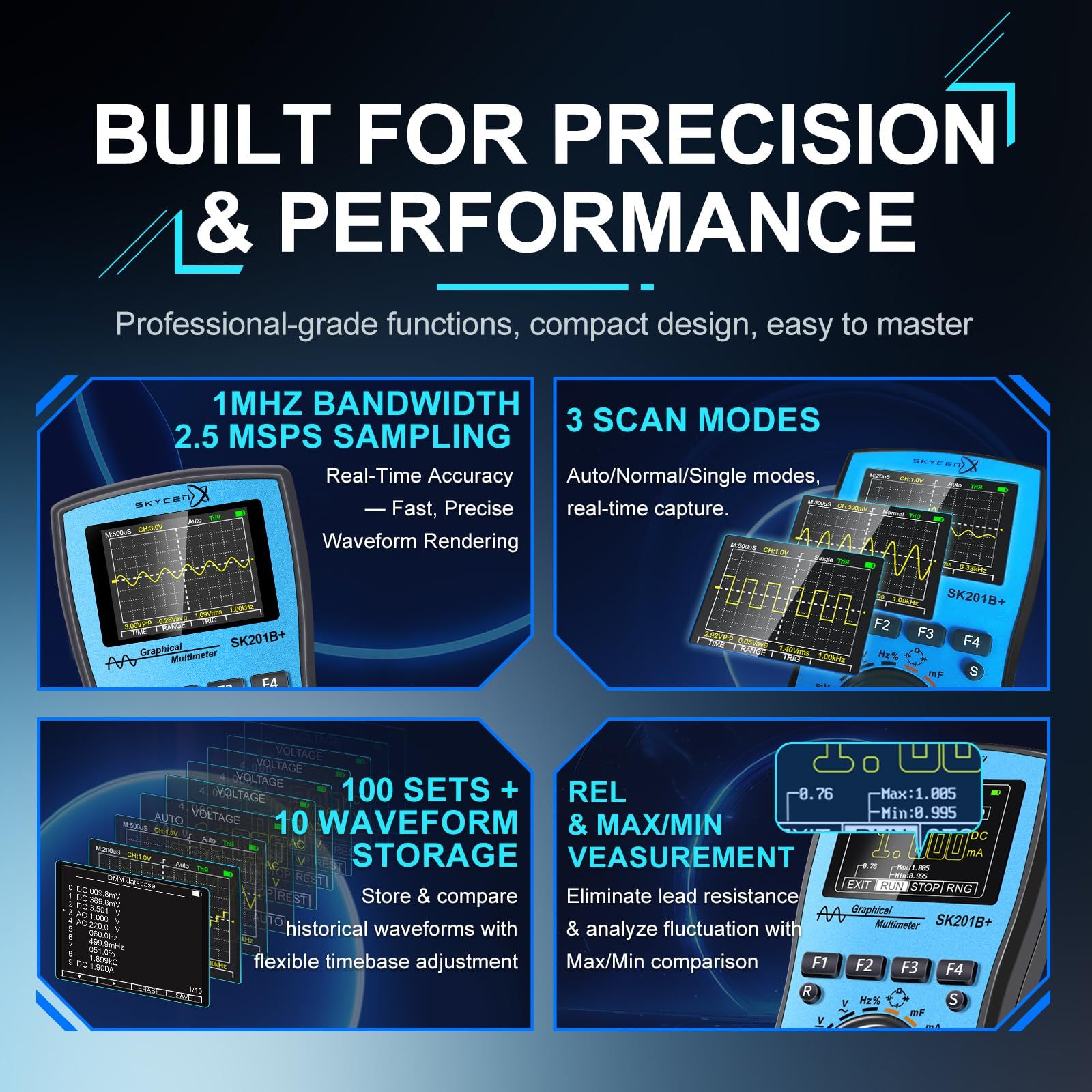 【高速サンプリング&広帯域幅】Skycenxデジタルマルチメーターは、2.5Mspsの高速サンプリングと1MHzのアナログ帯域幅(ACVモードのみ)が特徴で、正確で高速な信号キャプチャをします。 ▼