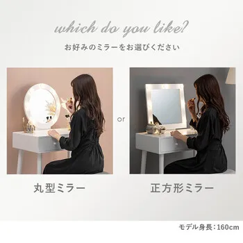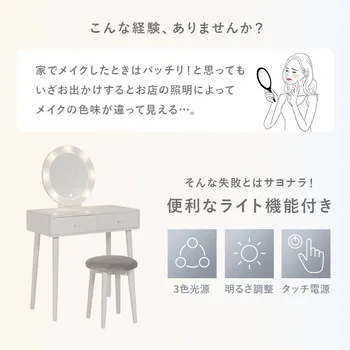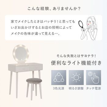 ■本体サイズ:ドレッサー:(約)幅75×奥行47×高さ122×天板高75.5cm、スツール:(約)幅36×奥行36×高さ45cm