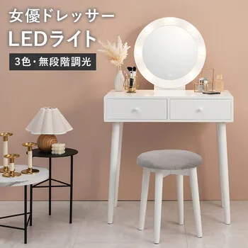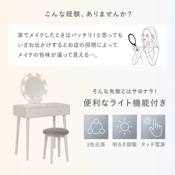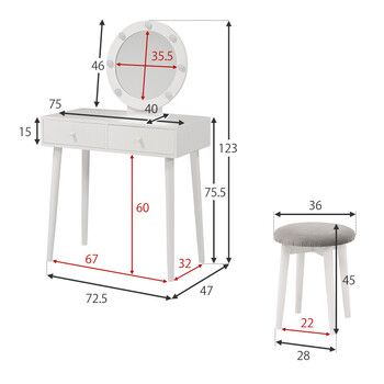 ■本体サイズ:ドレッサー:(約)幅75×奥行47×高さ123×天板高75.5cm、スツール:(約)幅36×奥行36×高さ45cm