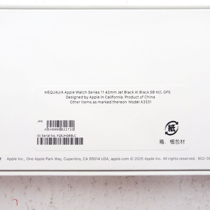 【 商品名 】 Apple Watch Series 11 GPSモデル 42mm ジェットブラックアルミニウムケースと ブラックスポーツバンド バンドサイズ:M/L MEQU4J/A Serial No. FQ5JHG69LC