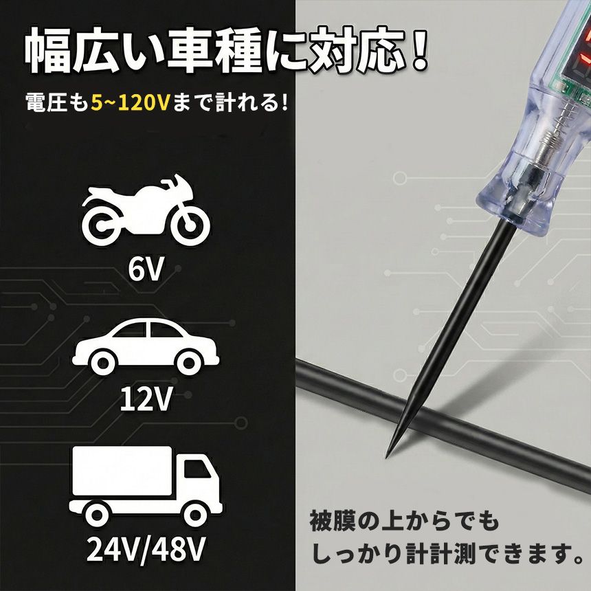 検電テスター デジタル 電圧計 車 バイク 5V-120V 故障診断 通電確認 LED判定 バッテリー チェッカー 配線 整備 工具 DIY メンテナンス 電装品 取り付け アースクリップ コイルケーブル サーキットテスター