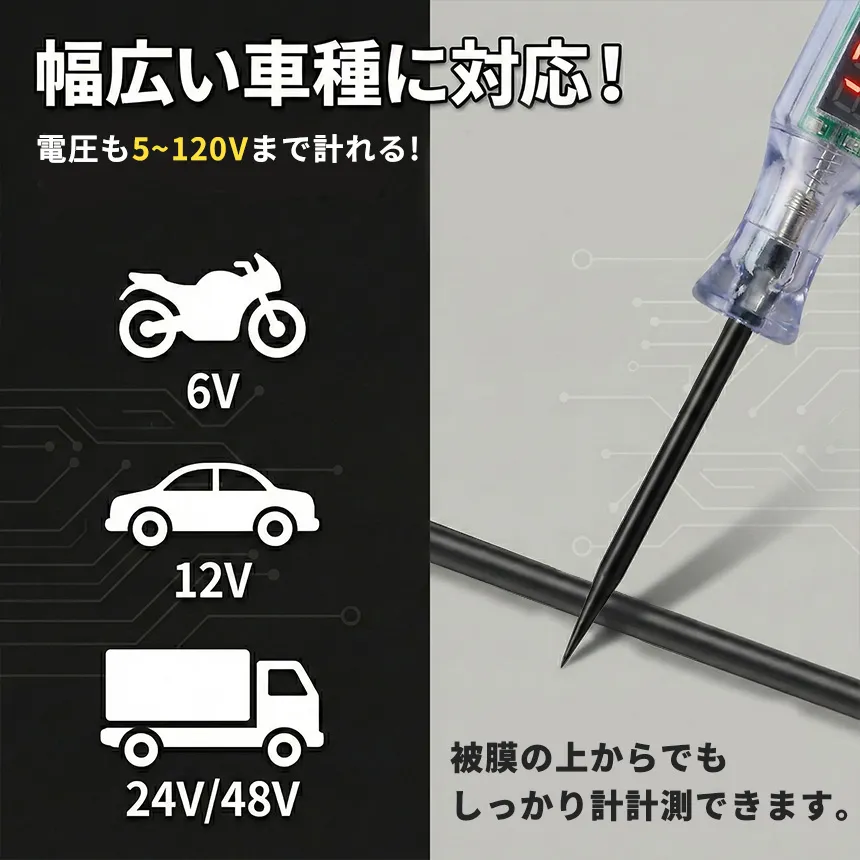 ■5V〜120Vまで!幅広い電圧に対応 測定可能範囲は5V〜120Vと広範囲をカバー。 一般的な乗用車はもちろん、トラックやバイク、その他様々な車両の電圧チェックに対応可能です。