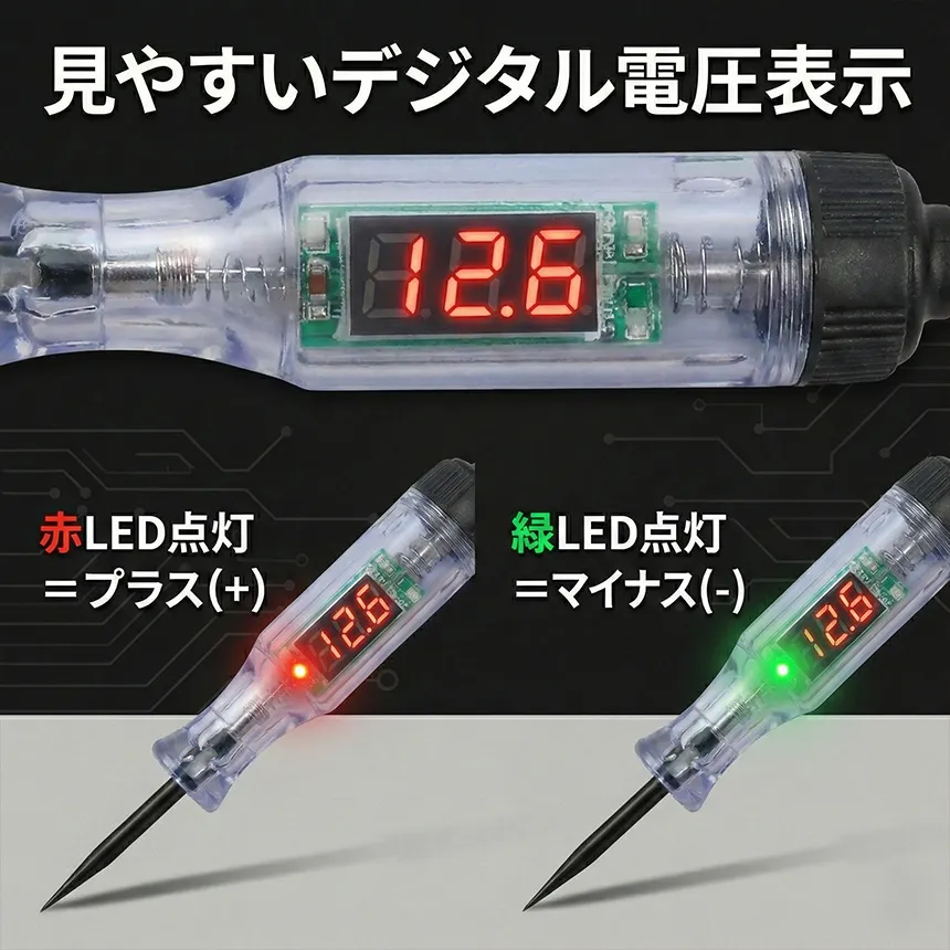 【様々なシーンで大活躍】 プロの整備士からDIYユーザーまで、幅広くご利用いただけます。 ・メンテナンスで:バッテリーの劣化具合の確認、ヒューズ切れの確認に。 ・パーツ取り付けで:ドライブレコーダー、LEDライト、オーディオ等の電装品取り付け時の電源確保(ACC/常時電源探し)に。 ・トラブル時に:エンジンがかからない、ライトがつかない等の故障診断に。 常備工具の一つとしておすすめです。