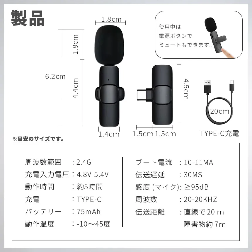 【製品】 〇種類 2人用:マイク2、レシーバー1 〇サイズ マイク:約6.2×1.8cm レシーバー:約4.5×3cm 〇スペック 周波数範囲:2.4G 充電入力電圧:4.8V-5.4V 動作時間:約5時間 充電:TYPE-C(付属) バッテリー:75mAh 動作温度:-10〜45度 ブート電流:10-11MA 伝送遅延:30MS 感度 (マイク):?95dB 周波数:20-20KHZ 伝送距離:直線で 20m、障害物約7m ※日本語取扱説明書、撮影用小物類などは付属しておりません。 ※簡易包装でのお届けとなります。 ※モニターにより色合いが若干違いが生じる場合がございます。 ※デザインは入荷時期により若干変化する場合がございます ※海外製造品のため、多少の匂い軽微な傷や汚れ、個体差等ある場合がございます。 ※商品の使用により生じた如何なる損害・被害も弊社では一切の 責任を負いかねますので予めご了承ください。 ※発送方法について:お届け先、個数によって配送情報に記載の配送業者とは異なる場合がございます。日本郵便、佐川急便、ヤマト運輸、またはセイノーエクスプレス(大型商品)でお届けいたします。なお、配送業者はお選びいただけませんので、ご了承ください。
