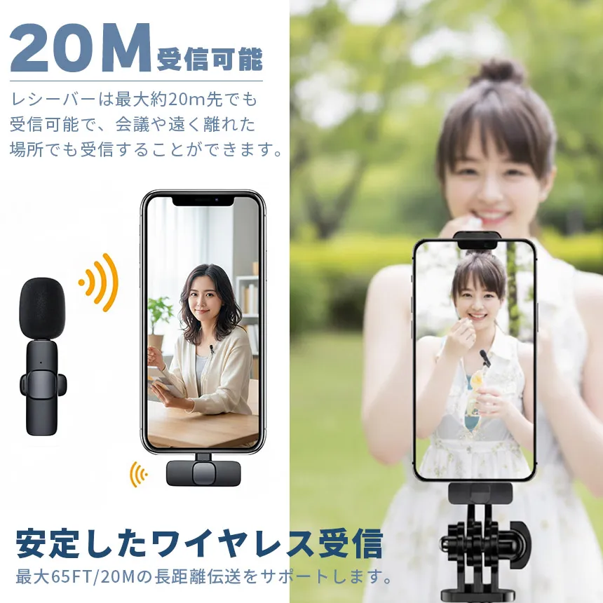 【設定いらずの簡単仕様】 受信機はスマホから直接給電。しかもつけたままTYPE-Cを挿してスマホ充電可能! 面倒なBluetooth接続やアプリ設定は不要です。 デバイスにレシーバーを挿し、マイク電源1秒押せばすぐ使用可能。 使用中、電源ボタンでミュートできます。 その際は、マイクのランプが点滅し、ミュートなのが一目でわかります。
