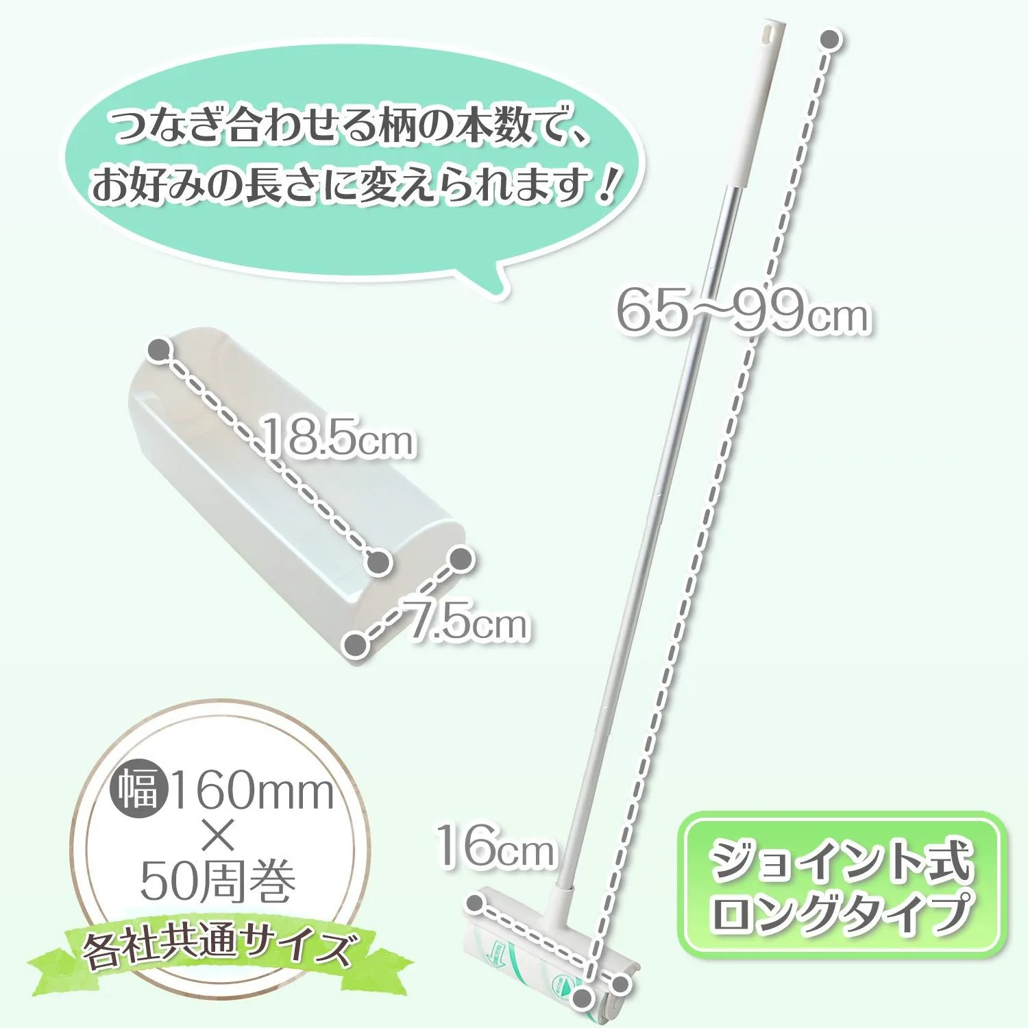 ●ジョイント組立式なので、つなぎ合わせる柄の本数で長さの調整ができます(最長約99cm)。