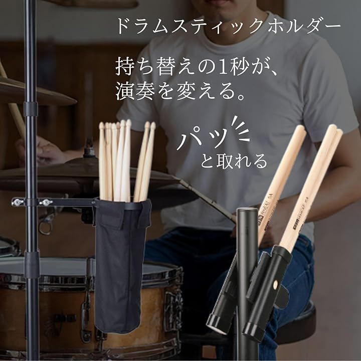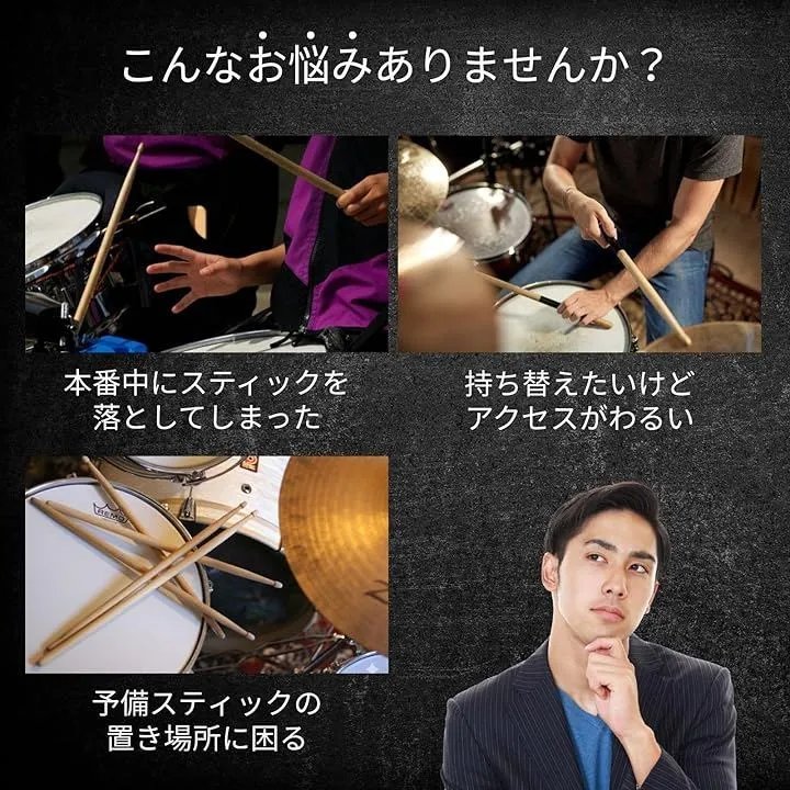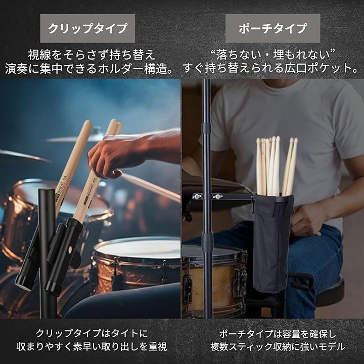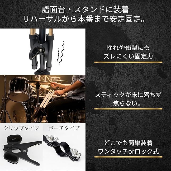 スティックを床に置けない現場や予備スティックを身近に置きたい演奏者に向けた実用品として、リズムの流れを止めず演奏クオリティの維持に貢献します。