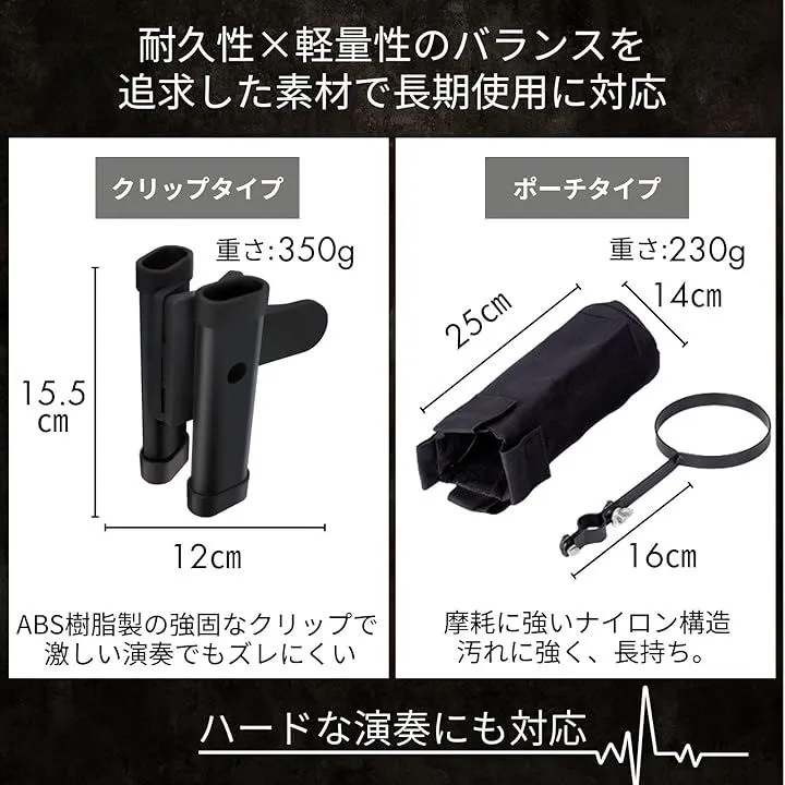 どちらも反復的な着脱に耐えられる構造で、ドラムセット横のフレーム・スネアスタンド・シンバルスタンド・譜面台・マイクスタンドへ簡単に取り付け可能。