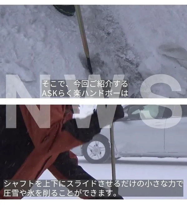 【ご注意下さい】 ロードヒーティングや融雪解氷工事施工面、屋根等には利用しないでください 強くスライドさせると地面、アスファルト、タイル等をキズつけるおそれがありますので無理な力を入れないでください 氷割り以外の目的に使用しないでください 季節商品は注文後の変更、交換、キャンセルはお受付出来ません 形状、寸法など必ずご確認下さい ------- ・氷や圧接の雪割りに最適、らく楽ハンドボー ピンポイントヤリ型、万能タイプバチ型、破壊力抜群のキバ型のシリーズラインナップ ・ヤリは氷割に、バチは剥がしに適しています ヤリは割りたい氷の表面に先端を垂直に、バチは剥がしたい氷の面に先端を斜めに当てます 片手でハンドボーを押さえ、もう一方の手でグリップを握り上下にスライドさせてください ・軽い力で威力を発揮、グリップを上下するだけなので女性やご年配のお客様も簡単操作 ・立ったまま作業ができるので腰や肩にやさしい ・スライドハンマータイプなので氷のはねかえりが少なく安心安全 ・ツルハシと違い場所をとらないので保管にも便利 ・除雪用品として ※弊社取扱らく楽ハンドボーはメーカー様純正品 他店舗様販売の同等品などの詳細はわかりかねます