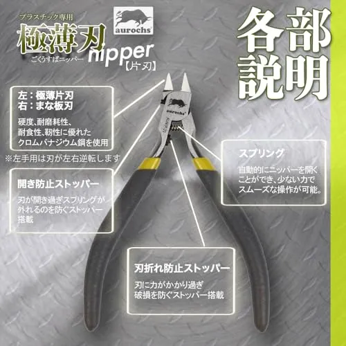 極薄に仕上げられた片刃構造のプラスチック切断専用ニッパー。 薄く繊細に研ぎ出された刃先は通常のニッパーよりも美しくゲートを切断可能です。切れ味の良い極薄片刃が片方から真っ直ぐ切断することにより プラスチックの白化も少なく切断後のヤスリがけ作業も大幅軽減、作業効率大幅アップ。