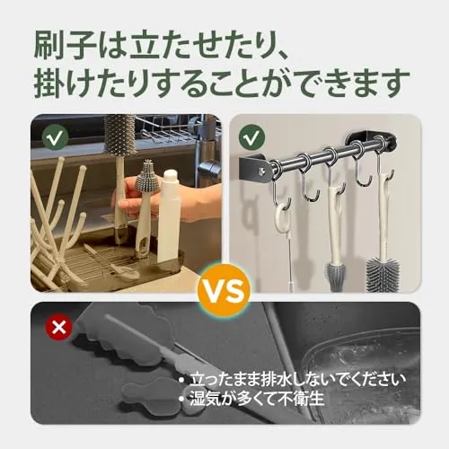 哺乳瓶ブラシは、哺乳瓶ラックのスロットにしっかり固定でき、空気乾燥させながら衛生的に保管できます。哺乳瓶洗い 持ち運びに最適な設計です。