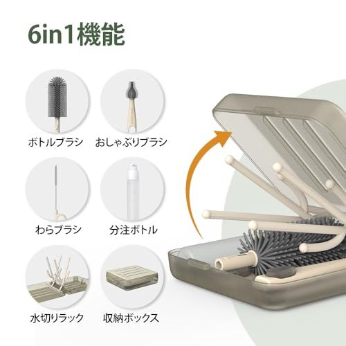 この6-in-1哺乳瓶洗い旅行セットには、哺乳瓶ブラシ、乳首ブラシ、ストローブラシ、ソープディスペンサー、哺乳瓶ラック、収納ボックスが含まれており、哺乳瓶洗浄と乾燥をこれ一つで簡単に行える携帯用セットです。