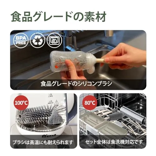 この哺乳瓶洗いセットは、食品グレードのPPと液体シリコンで作られており、BPAフリーで赤ちゃんにも安心してお使いいただけます。分解可能なデザインでお手入れが簡単で、食洗機にも対応しています。