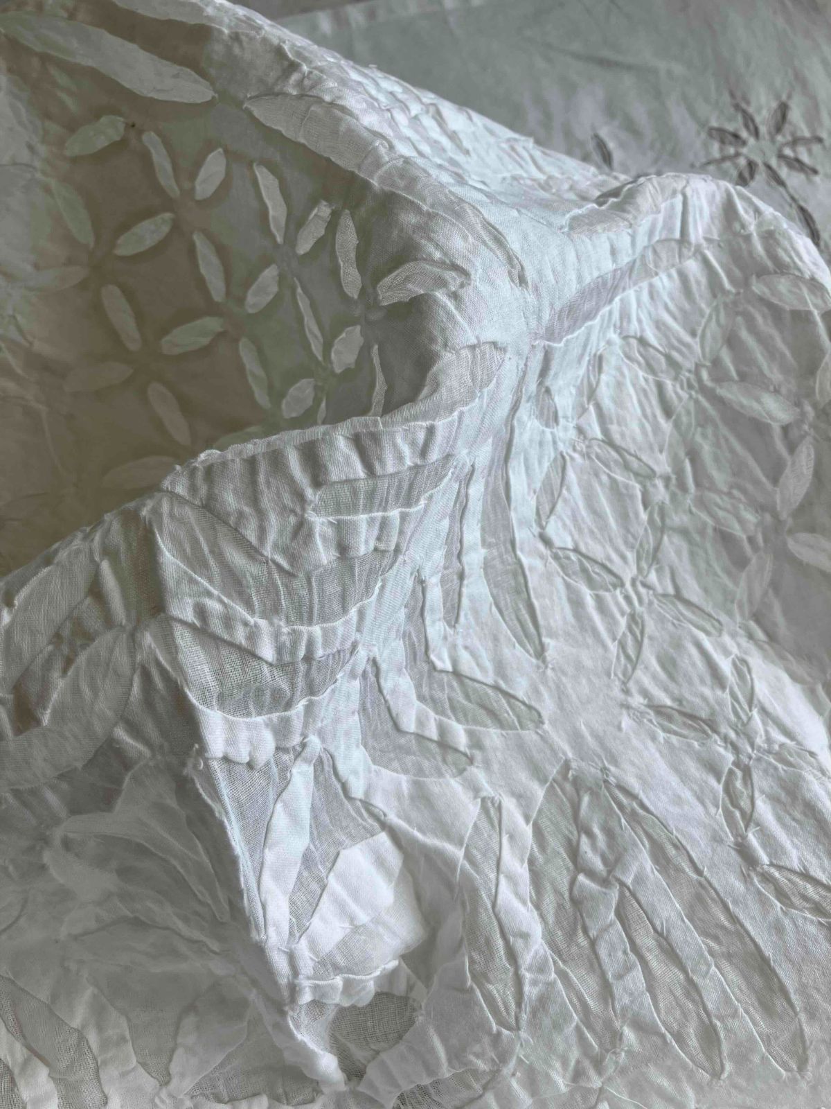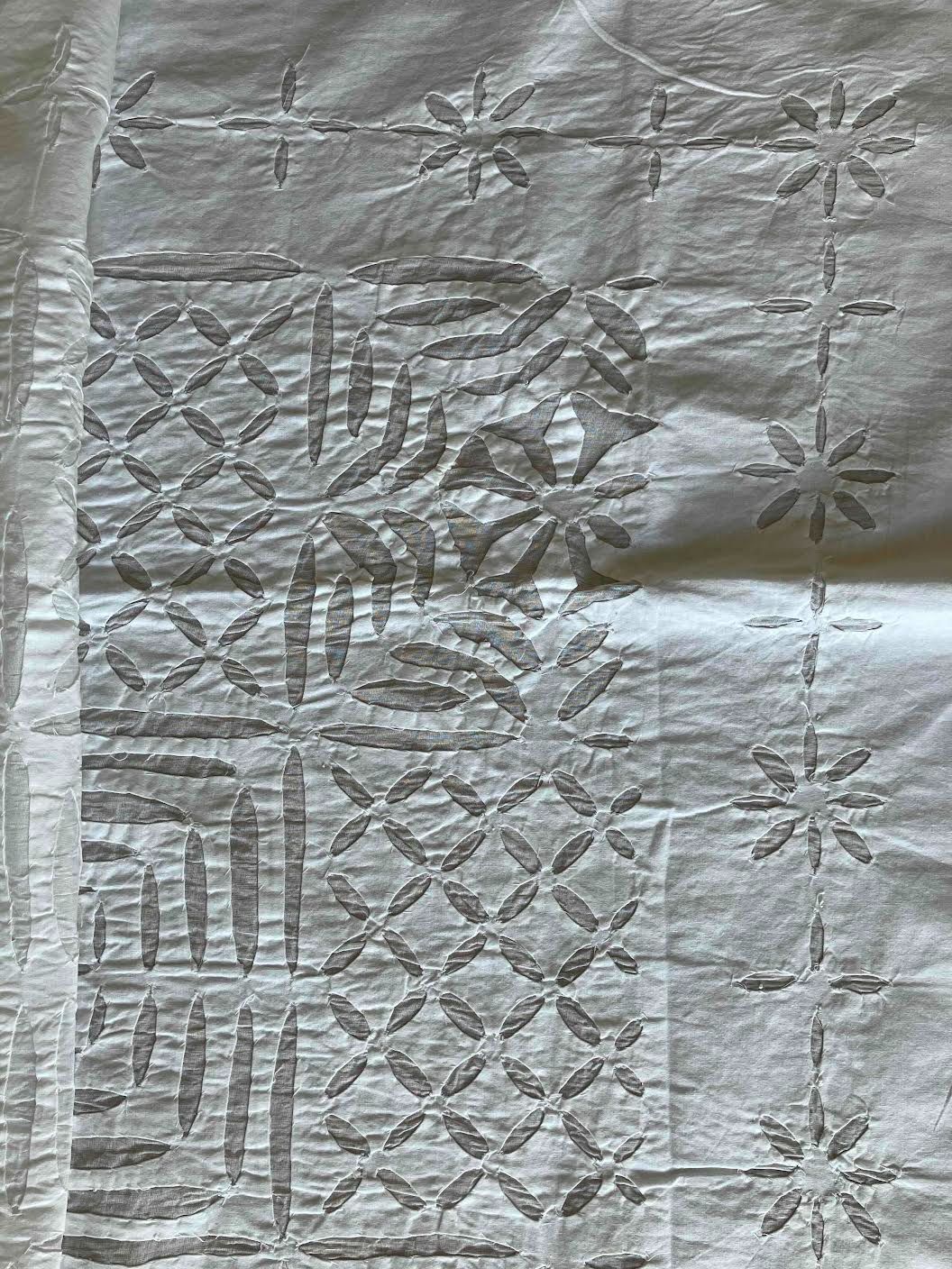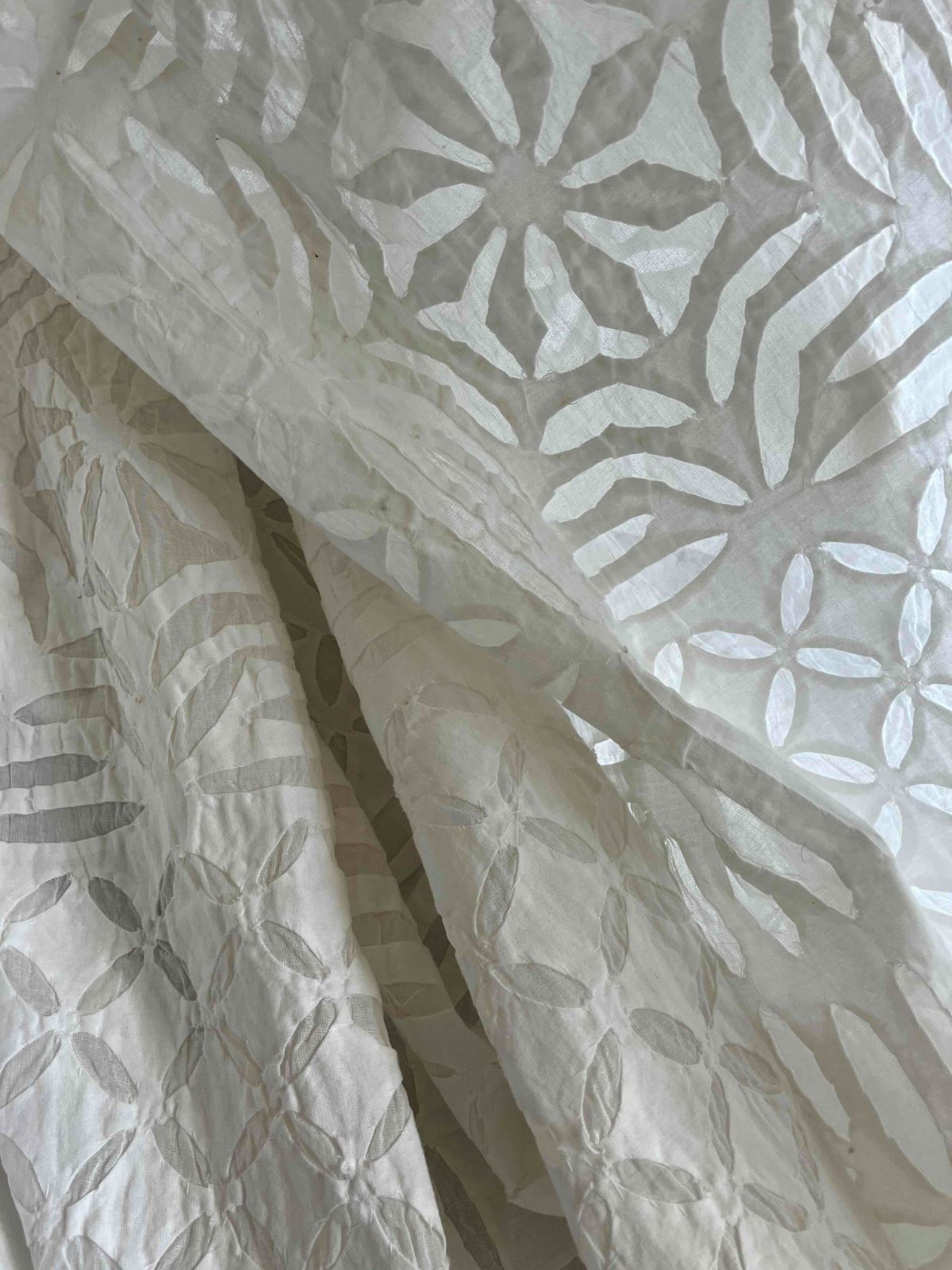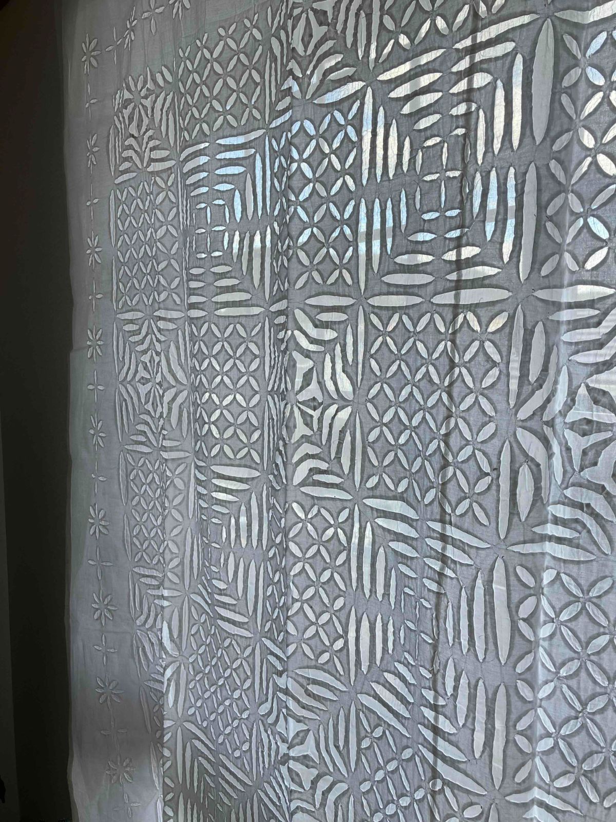 2重にコットンを重ねていますが、表面はカットワークという手法で柄を穴空けし手作業で裏布と縫い付けされています。