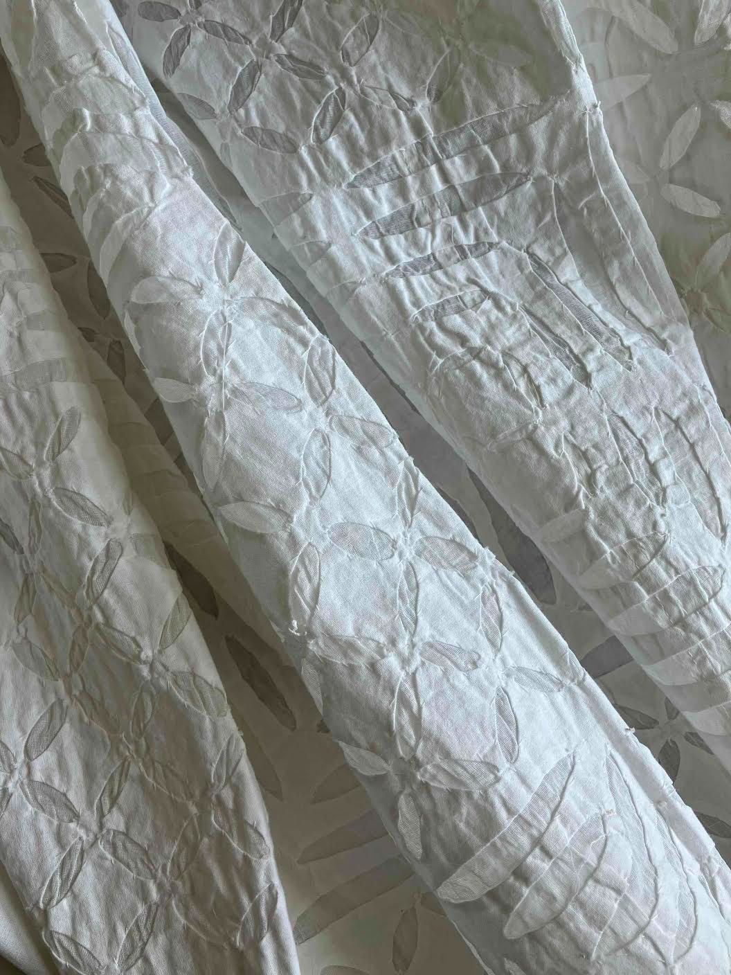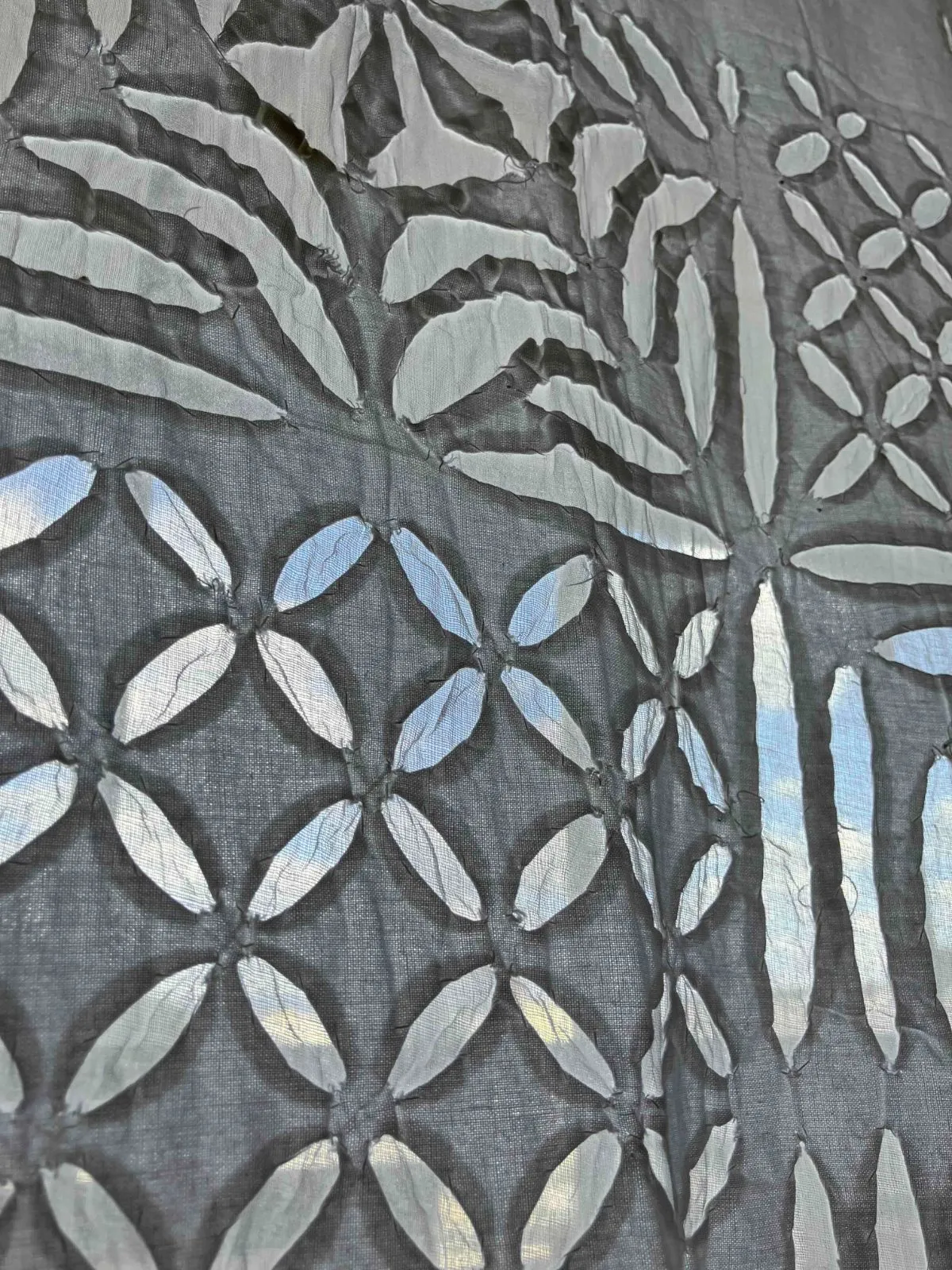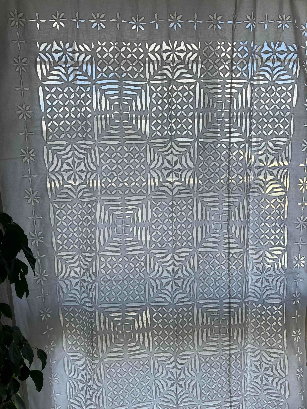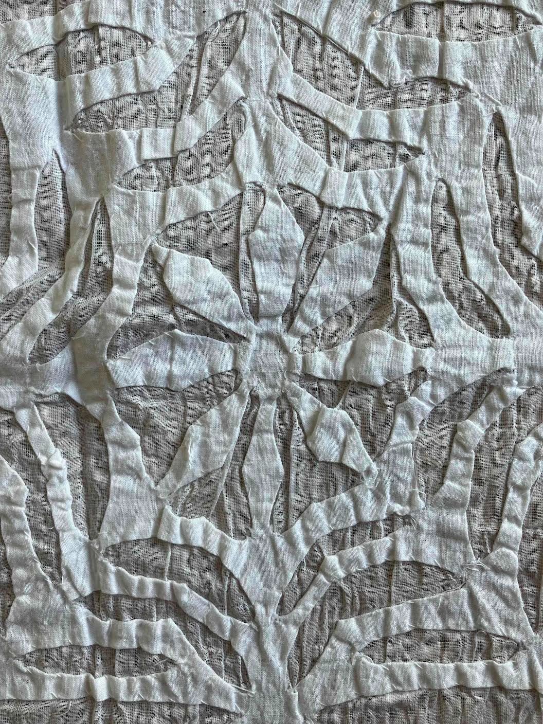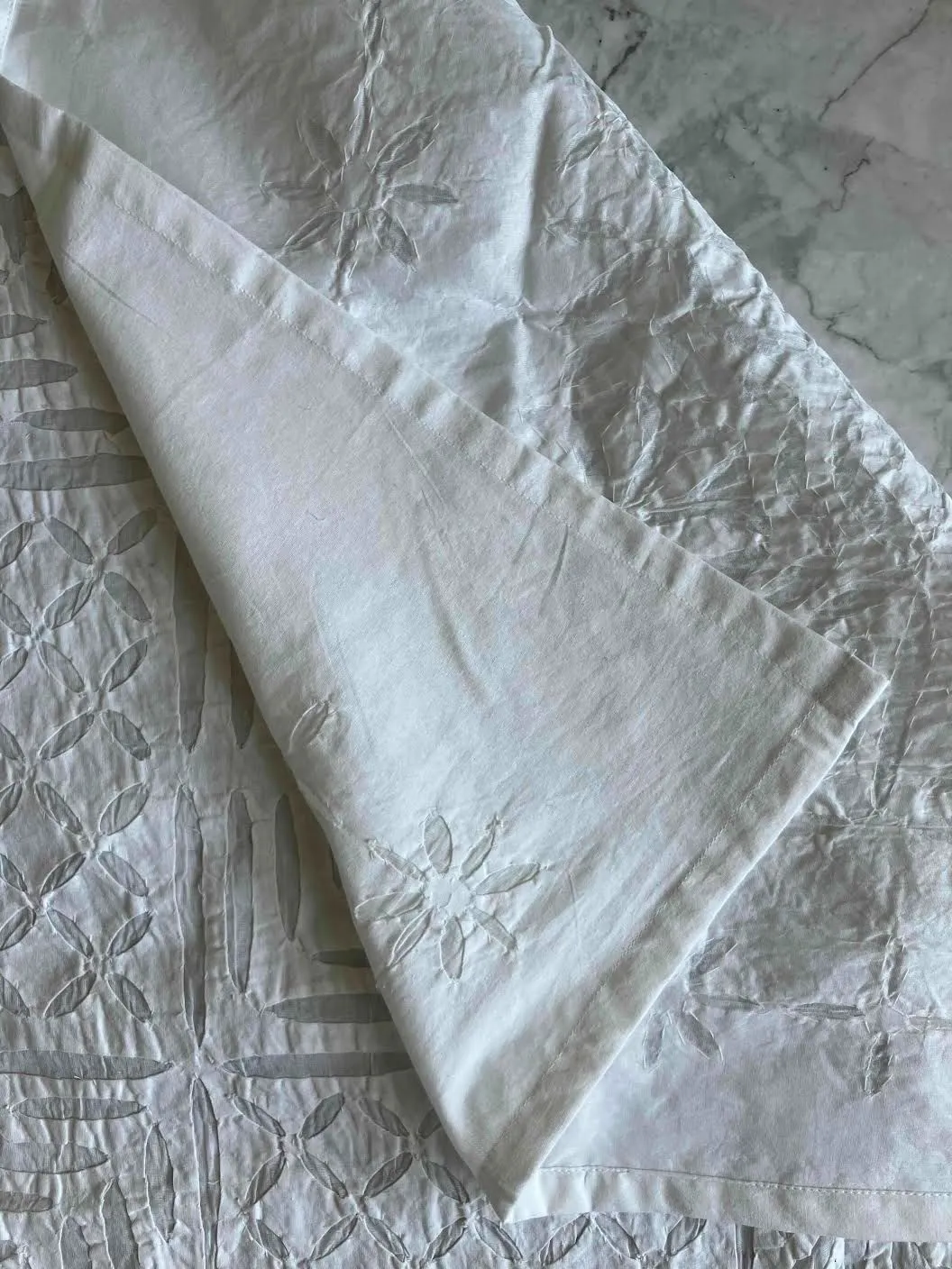 2重にコットンを重ねていますが、表面はカットワークという手法で柄を穴空けし手作業で裏布と縫い付けされています。