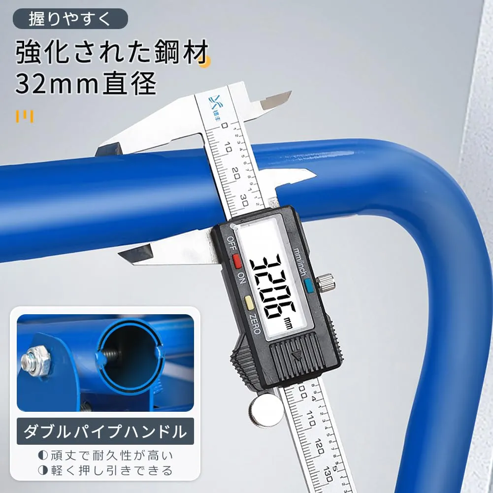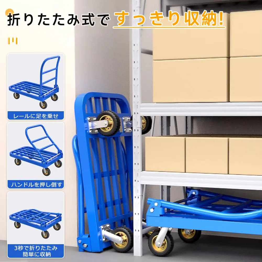 【 折りたたみ台車】ハンドルを踏んで簡単に折りたたむことができ、場所を取らずコンパクトに収納でき、持ち手を折り畳めて29cm程度になります。キャスターは360°フレキシブルに回転し、なので、誰でも簡単に組み立て・設置作業を行うことができます。