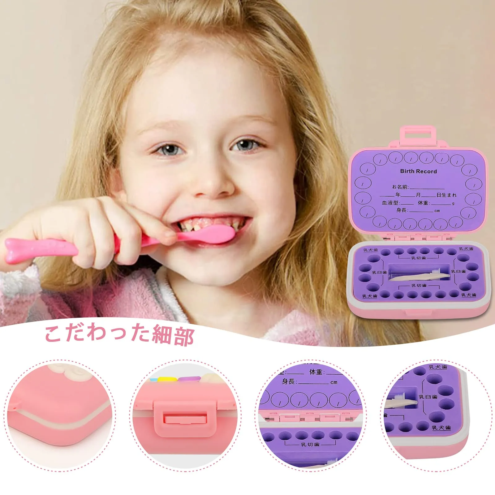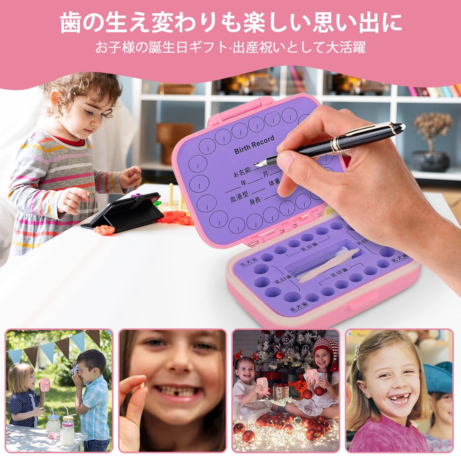 【抜けた歯を入れるケース】:抜けた歯の位置が一目でわかる、歯の配置デザインの乳歯ケースが子供の乳歯保存だけではなくて、名前、誕生日、生まれた時の身長や体重、血液型など子供のプロフィールも書き込めます。