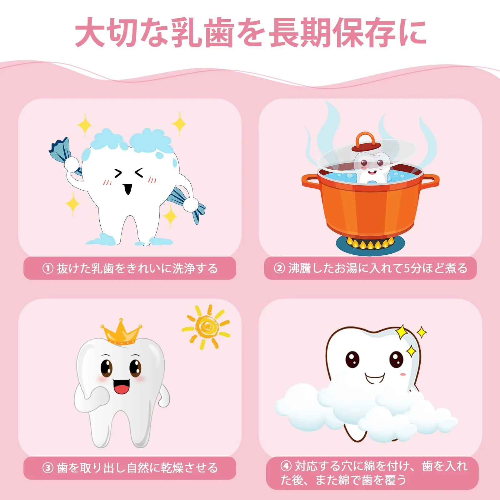 【乳歯の保存方法】 1. 乳歯をきれいに洗浄した上、沸騰したお湯に5分間ほど置きます。 2. 自然に乾燥させます。 3. 対応する穴に綿を付けて、歯を入れた後、また綿で歯を覆います。 配送について、商品のサイズや配送先都道府県によって最適な配送業者を選択しております。 業者・配送方法の指定は承れません。ご了承ください。 万が一の不着、紛失、誤配送の場合など、最後まで責任もって対応致しますのでご安心下さい。 宜しくお願い致します。