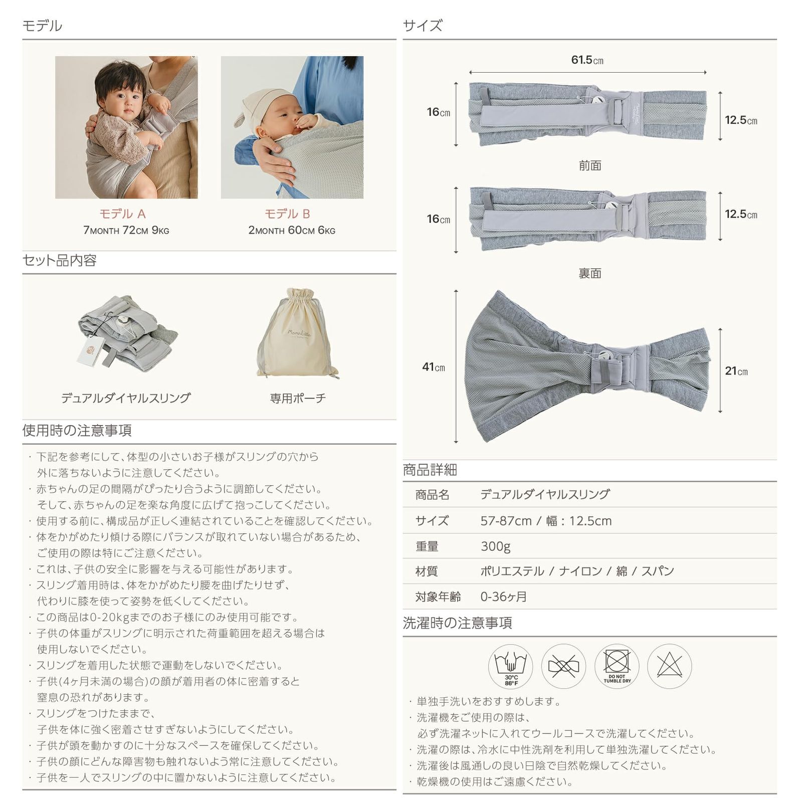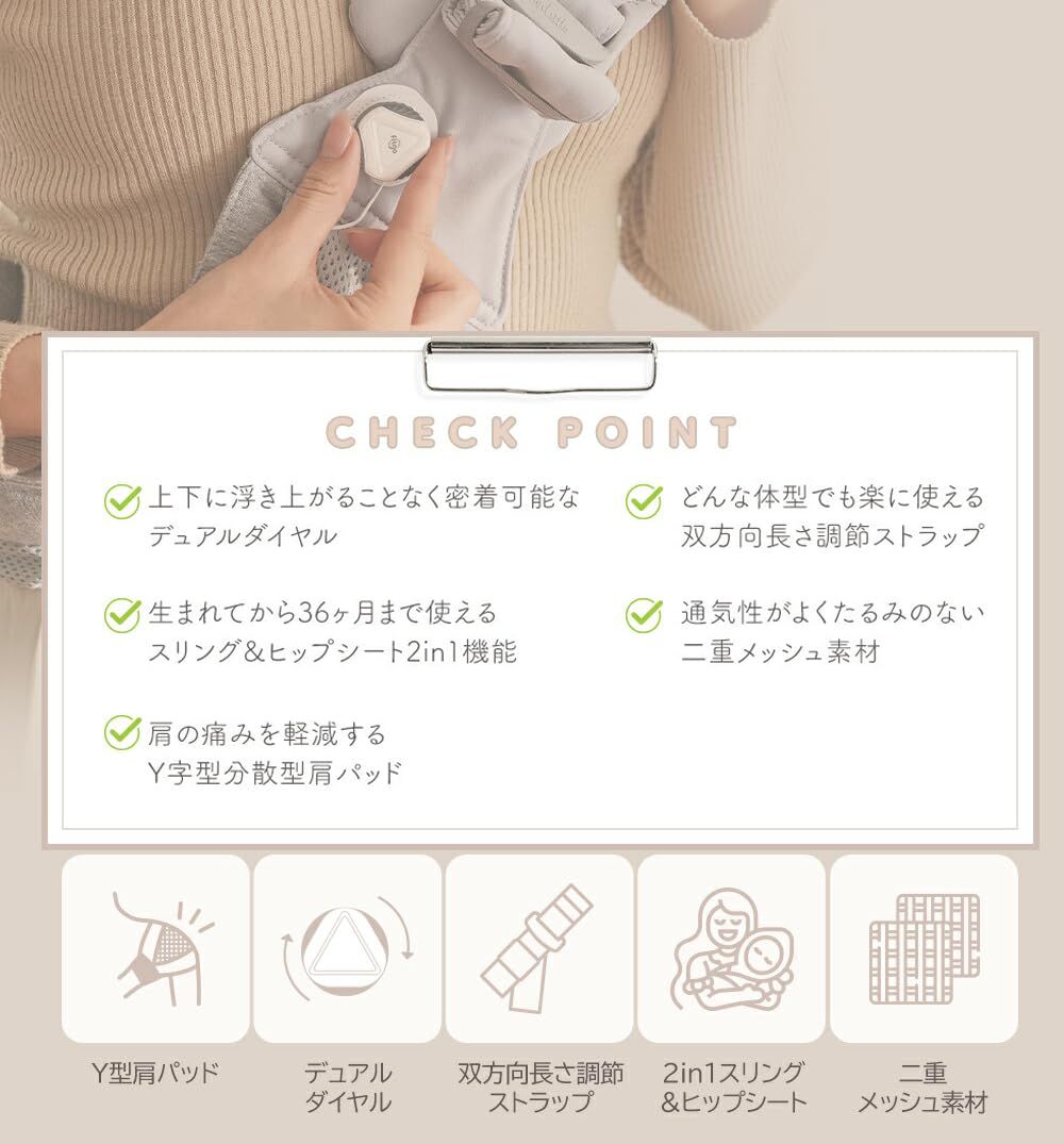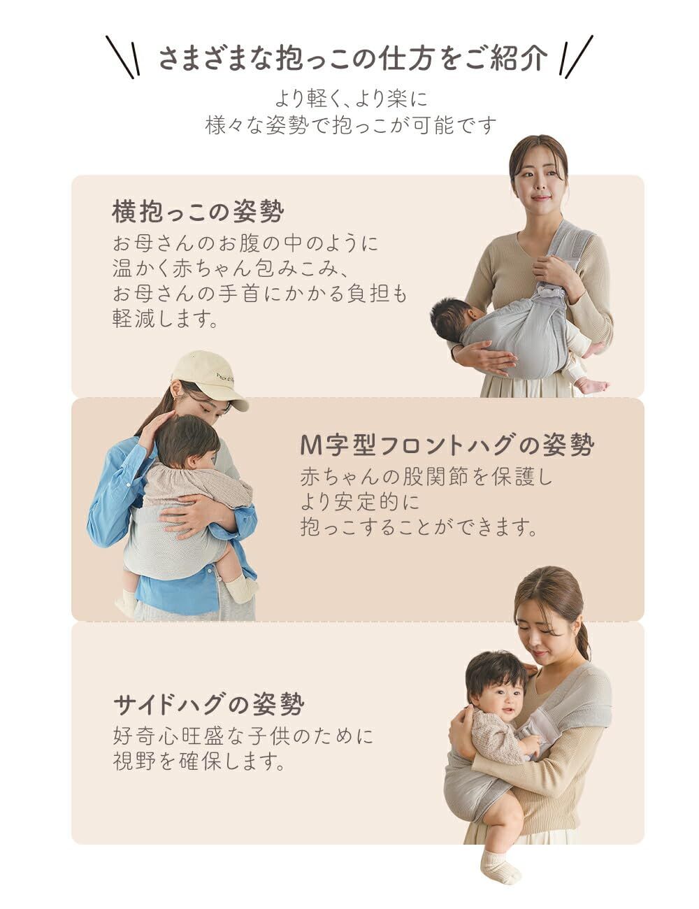 0?6ヶ月には横向き抱っこ、6?36か月には縦抱っこで、より快適に長くお使いいただけます。