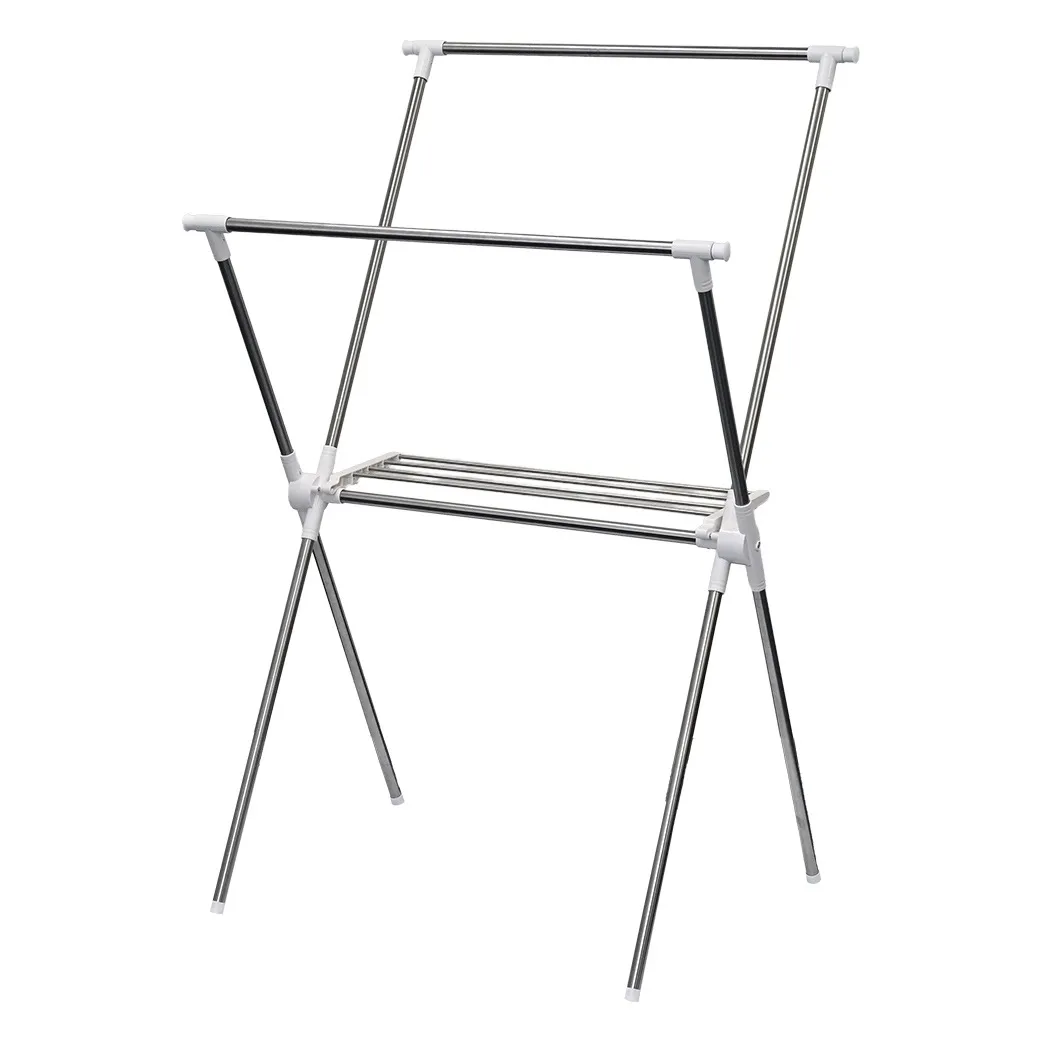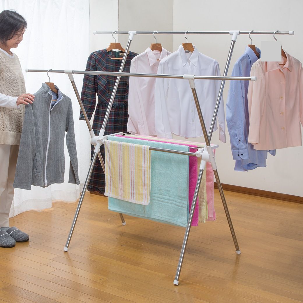 X型ステンレス室内物干しスタンド(タオル掛け付き) 小物ハンガー付 部屋干しハンガー 省スペース