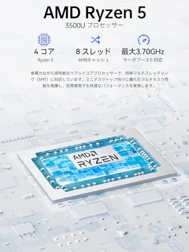 【高性能Ryzen 5 3500U搭載4コア8スレッド】GMKtec G10は、4コア8スレッド・最大3.7GHzのRyzen 5 3500Uを搭載。N100などの省電力CPUと比べ、マルチタスクや動画再生、軽度な編集作業でも圧倒的な処理能力を発揮します。12nmプロセス製造で、省電力かつ高効率な動作を実現。