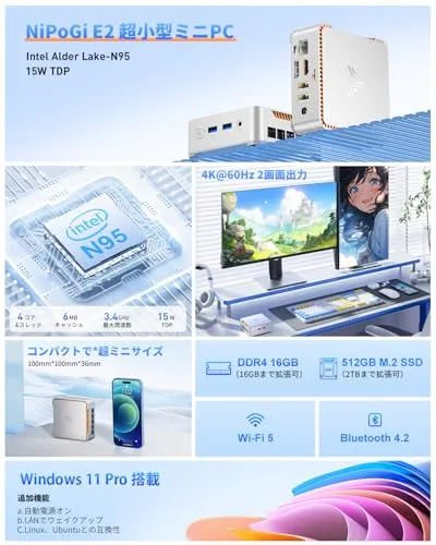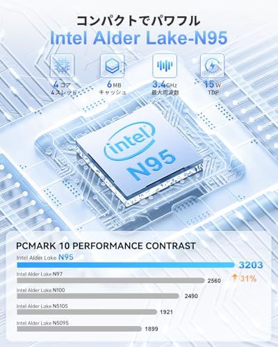 【N150より快適、第12世代N95・Windows11 ProミニPC登場】NiPoGi ミニpcは最新のインテル AlderLake-N95(最大周波数3.4GHz、4C/4T、6MBキャッシュ )プロセッサーを搭載し、従来のN150ミニPCと比べてパフォーマンスが大幅アップ。N97やN100などの旧世代CPUと比べても約30%もパフォーマンスが向上。ブルースクリーンや突然のシャットダウンも大幅減少し、サクサク快適に操作可能。ビジネス用サブPCはもちろん、ネット閲覧・文書作成・オンライン会議・動画視聴など日常作業もストレスなくこなせます。15Wの省電力設計で、普段使いから軽めのエンタメまで快適に活躍する万能型ミニPCです。