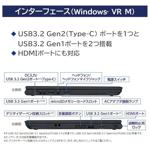 外部インターフェイス:USB Type-C (USB3.2 Gen2 (左側面1 Power Delivery対応、DisplayPort出力機能付き、ACアダプタの接続ポートを兼用))、USB3.2 Gen1(左側面1(パワーオフUSB充電機能付き)、右側面1) )、HDMIポート1、ヘッドフォン/ヘッドフォンマイク ジャック1、microSDメモリーカードスロット1