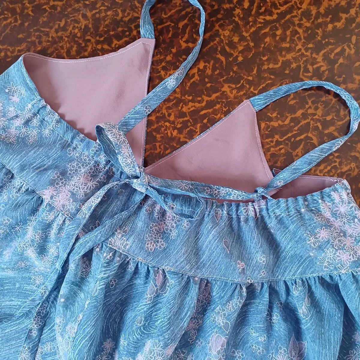 肩紐は後身頃のループを通して結び、調整出来ます。