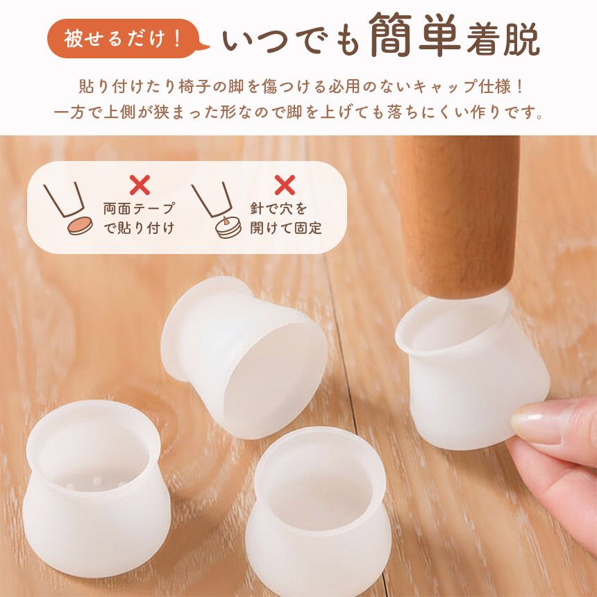 【簡単キャップタイプ】 脚に被せるだけで簡単に装着できるキャップタイプ! 両面テープで貼りつけたり針で固定するタイプに比べ椅子の脚を傷つけず装着でき、取れにくい仕様です。