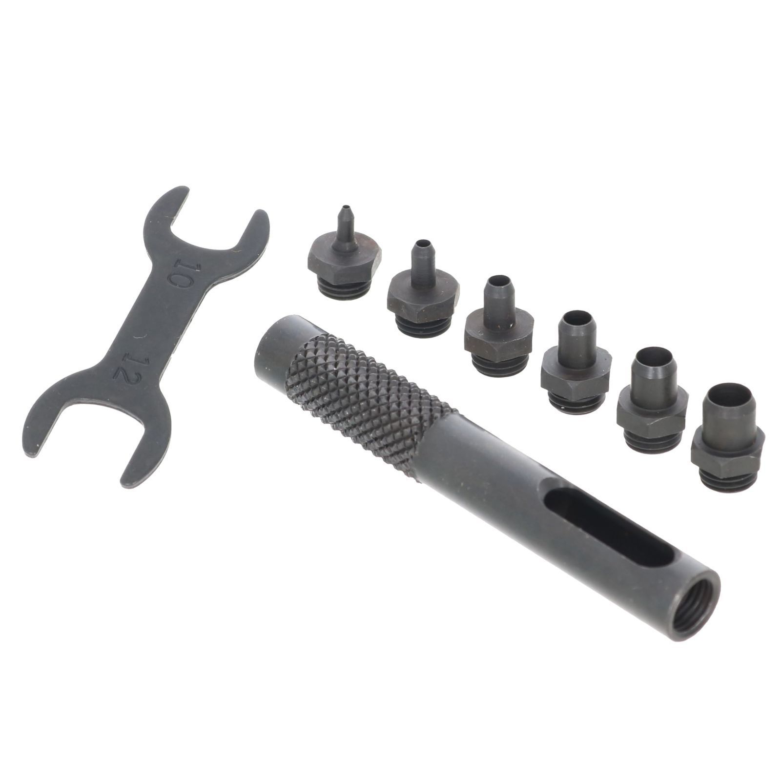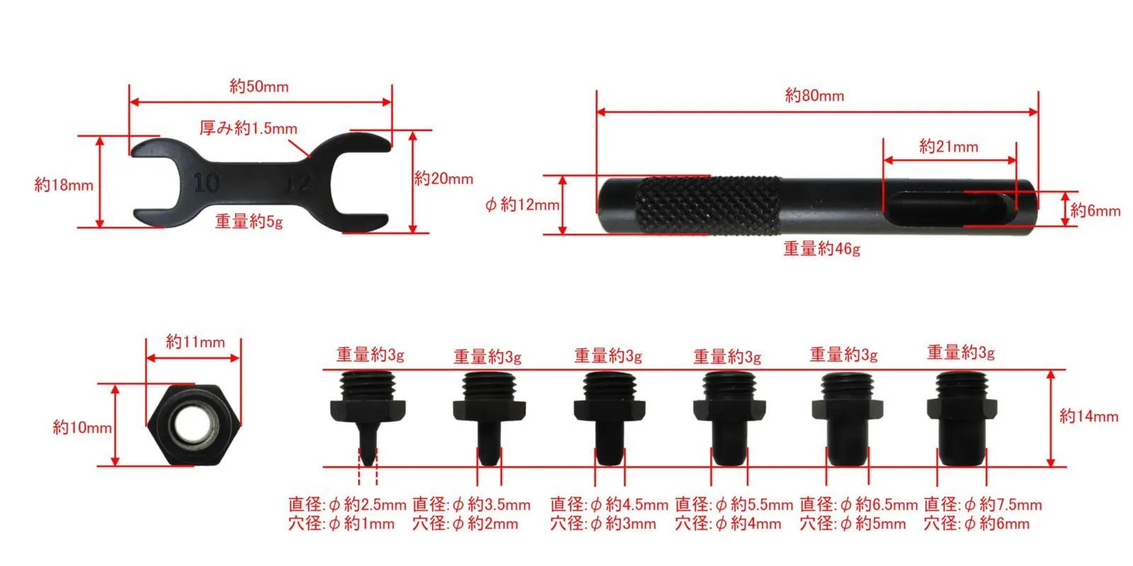 【セット内容】ポンチ(コマ):1mm/2mm/3mm/4mm/5mm/6mm×各1個、ホルダー×1、スパナ×1 ※付属のスパナは両口(10mm/12mm)になっておりますが、使用するのは10mmのみになります。