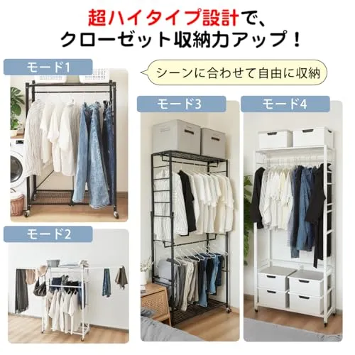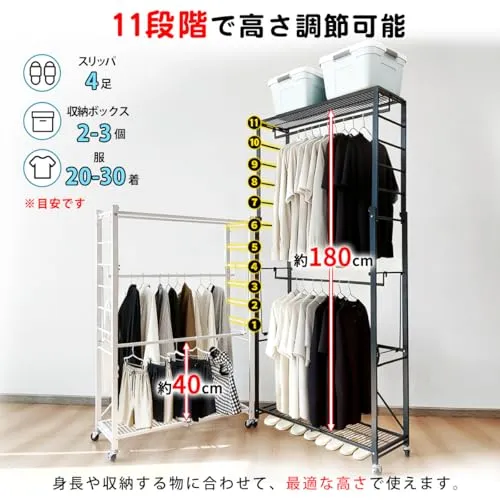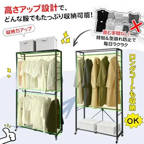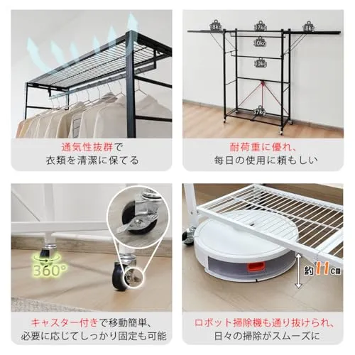 【キャスター付きで移動が楽々】この収納ラックにはストッパー付きキャスターが付いています。そのため、衣類などを置いたままでも楽に移動できます。掃除や配置換えなどの際にも便利で、移動中に勝手に動くことを防ぎます。また、安全面にも配慮しています。