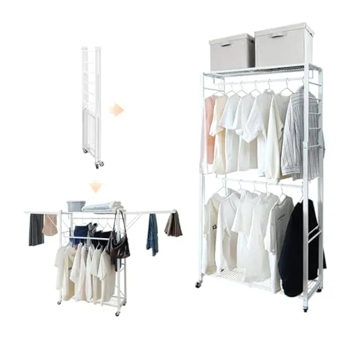 RAKU ハンガーラック 折りたたみ 大容量 ワードローブ たっぷり収納 キャスター付き 幅91 cm 防サビ塗装加工 頑丈 省スペース 棚付き メタルラック 収納ラック 洋服掛けスタンド オシャレ スリム 黒/白2色 (ホワイト)`